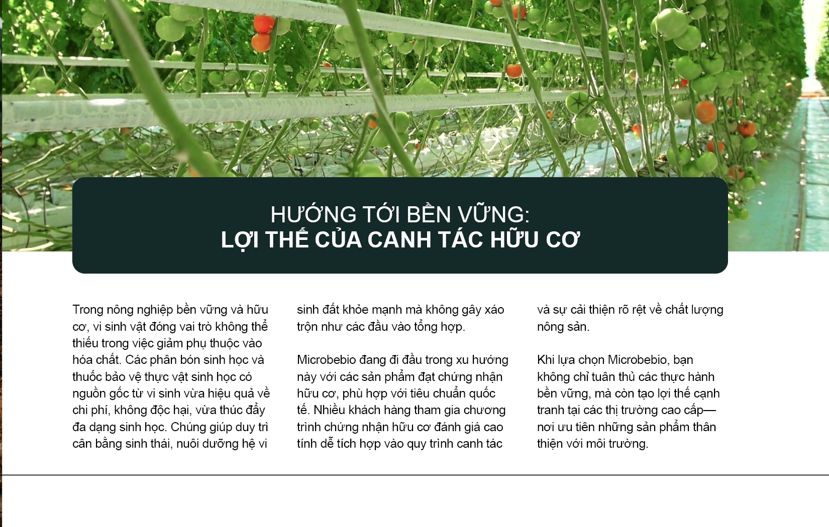Microbebio đang đi đầu trong xu hướng này với các sản phẩm đạt chứng nhận hữu cơ, phù hợp với tiêu chuẩn quốc tế. Nhiều khách hàng tham gia chương trình chứng nhận hữu cơ đánh giá cao tính dễ tích hợp vào quy trình canh tác và sự cải thiện rõ rệt về chất lượng nông sản.