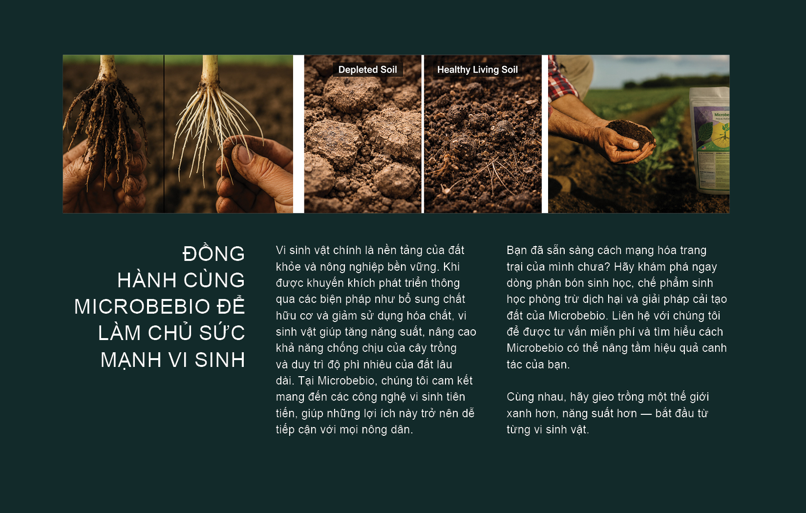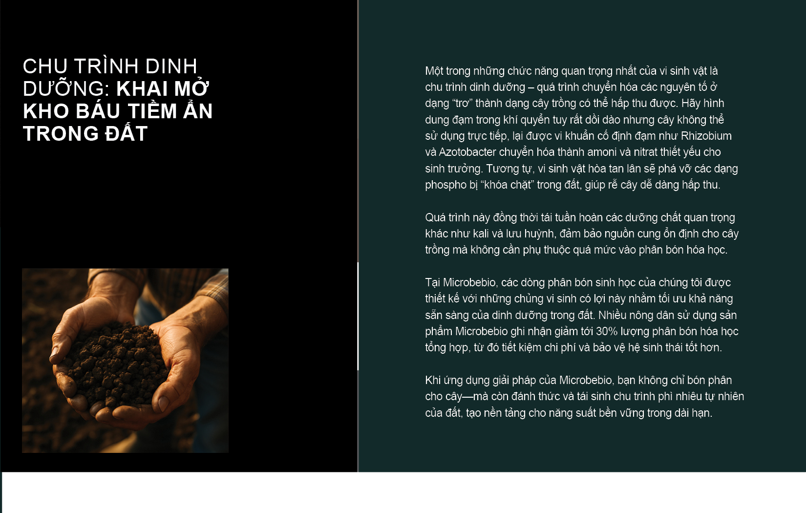 Khi ứng dụng giải pháp của Microbebio, bạn không chỉ bón phân cho cây—mà còn đánh thức và tái sinh chu trình phì nhiêu tự nhiên của đất, tạo nền tảng cho năng suất bền vững trong dài hạn.