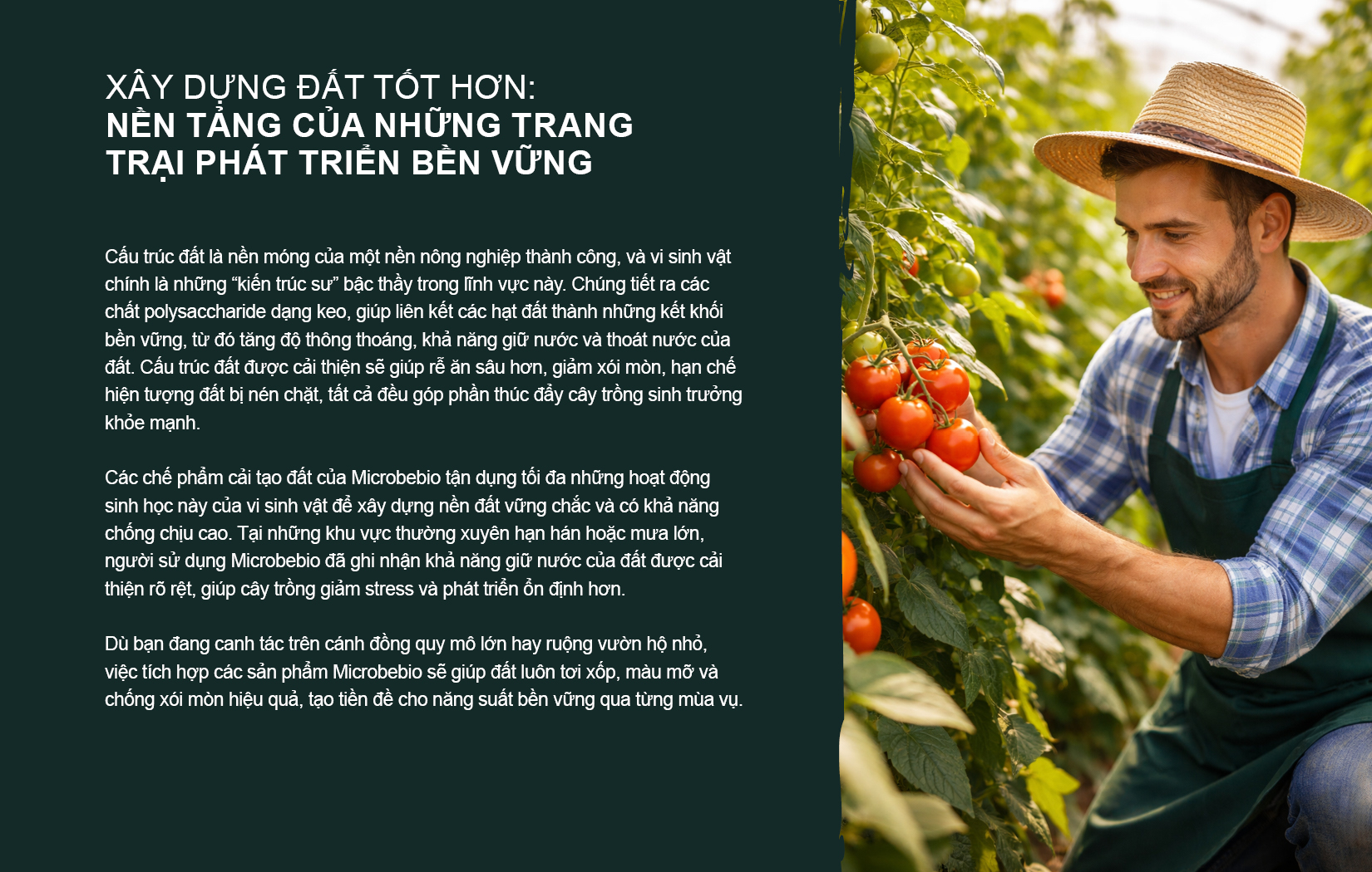 Các chế phẩm cải tạo đất của Microbebio tận dụng tối đa những hoạt động sinh học này của vi sinh vật để xây dựng nền đất vững chắc và có khả năng chống chịu cao. Tại những khu vực thường xuyên hạn hán hoặc mưa lớn, người sử dụng Microbebio đã ghi nhận khả năng giữ nước của đất được cải thiện rõ rệt, giúp cây trồng giảm stress và phát triển ổn định hơn.