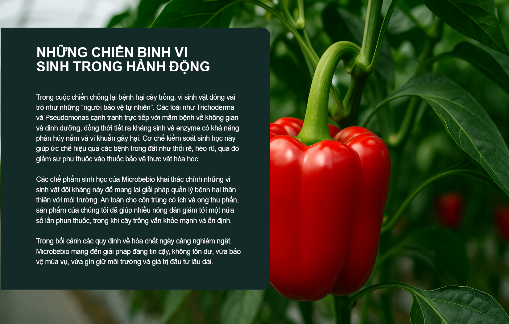 Trong bối cảnh các quy định về hóa chất ngày càng nghiêm ngặt, Microbebio mang đến giải pháp đáng tin cậy, không tồn dư, vừa bảo vệ mùa vụ, vừa gìn giữ môi trường và giá trị đầu tư lâu dài.