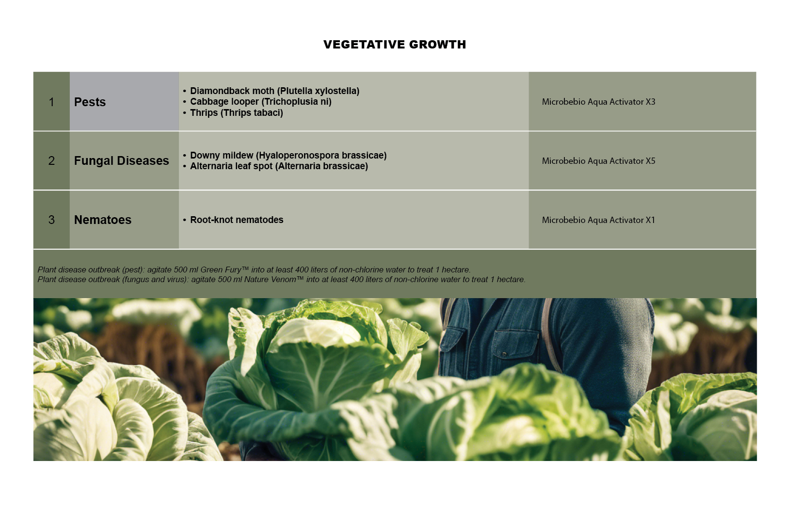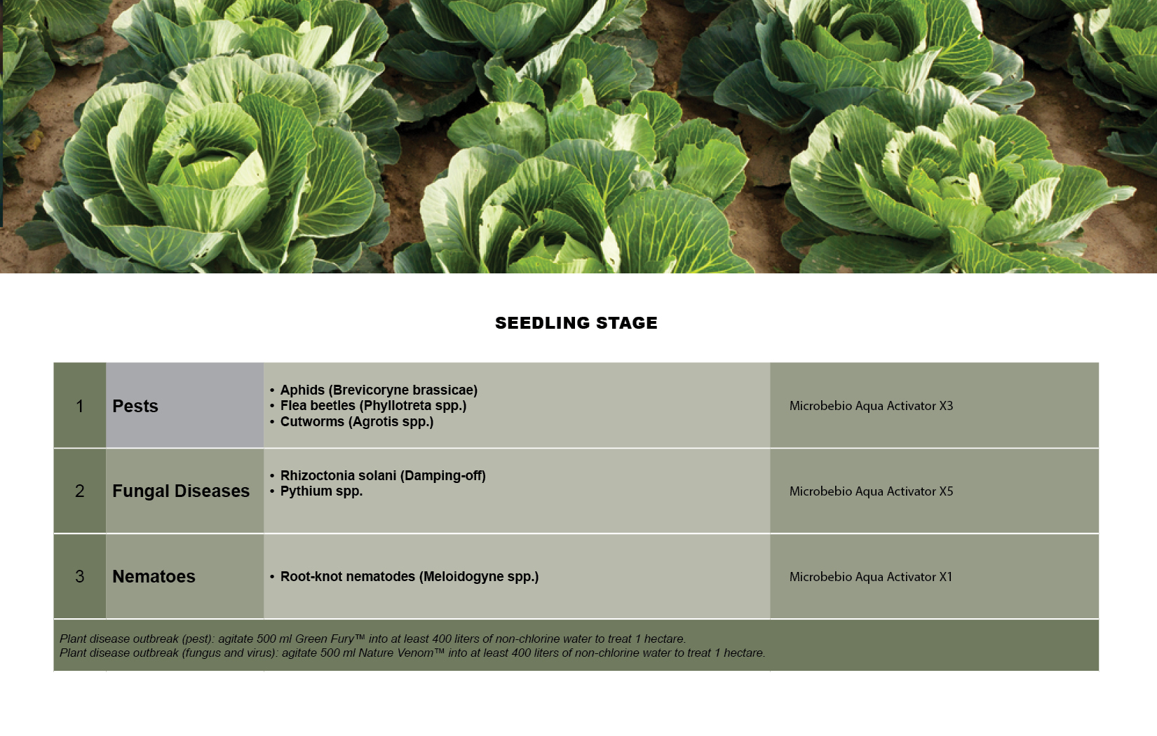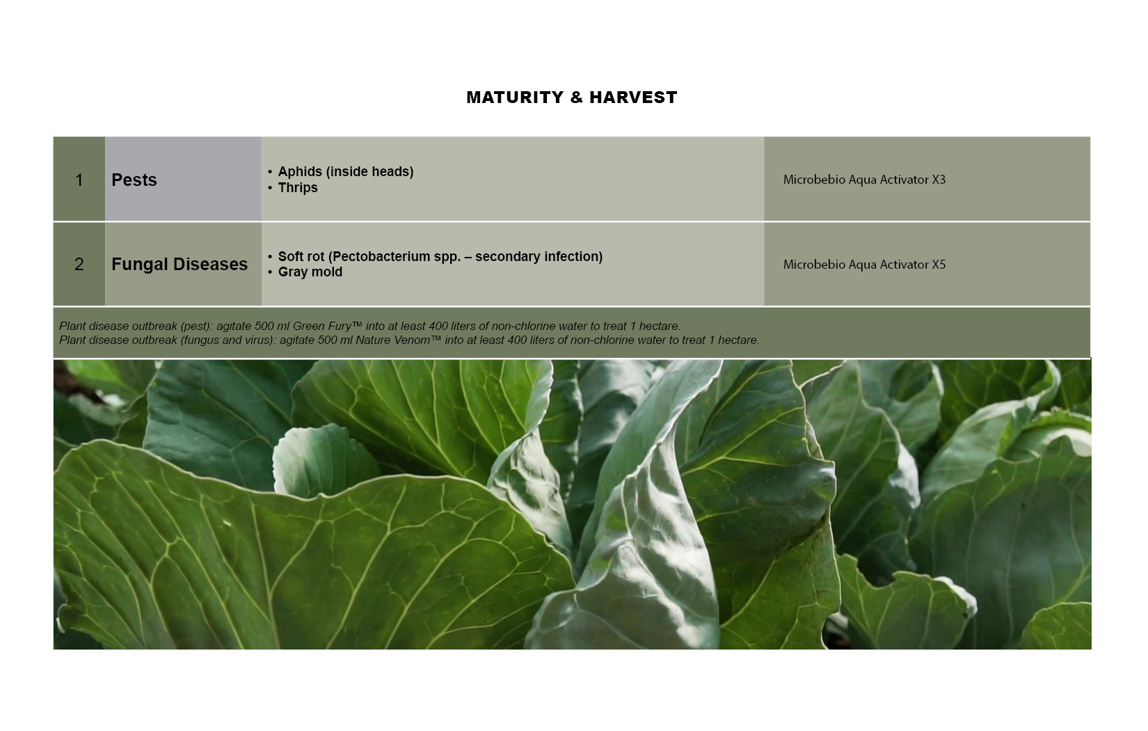 | * Green Fury™ (Pest) | Plant disease outbreak (pest): agitate 500 ml Green Fury™ into at least 400 liters of non-chlorine water to treat 1 hectare. |