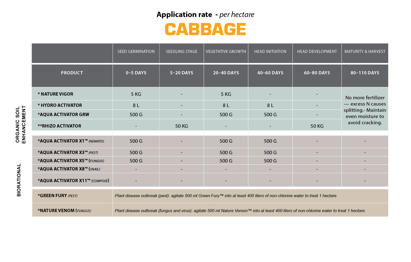 | * Nature Vigor | 5 KG | – | 5 KG | – | – | No more fertilizer — excess N causes splitting. Maintain even moisture to avoid cracking. |