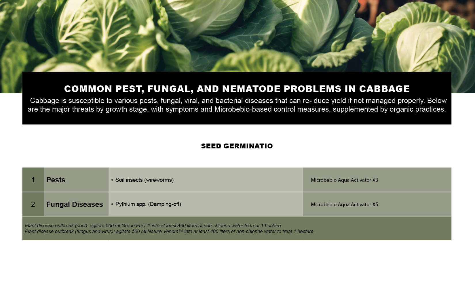 Cabbage is susceptible to various pests, fungal, viral, and bacterial diseases that can re- duce yield if not managed properly. Below are the major threats by growth stage, with symptoms and Microbebio-based control measures, supplemented by organic practices.