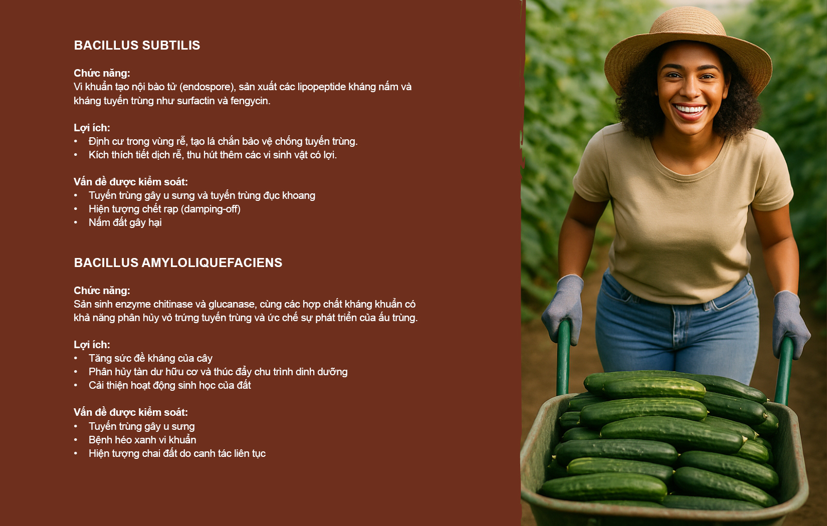 | Bacillus amyloliquefaciens | Sản sinh enzyme chitinase và glucanase, cùng các hợp chất kháng khuẩn có khả năng phân hủy vỏ trứng tuyến trùng và ức chế sự phát triển của ấu trùng. | • Tăng sức đề kháng của cây • Phân hủy tàn dư hữu cơ và thúc đẩy chu trình dinh dưỡng • Cải thiện hoạt động sinh học của đất |