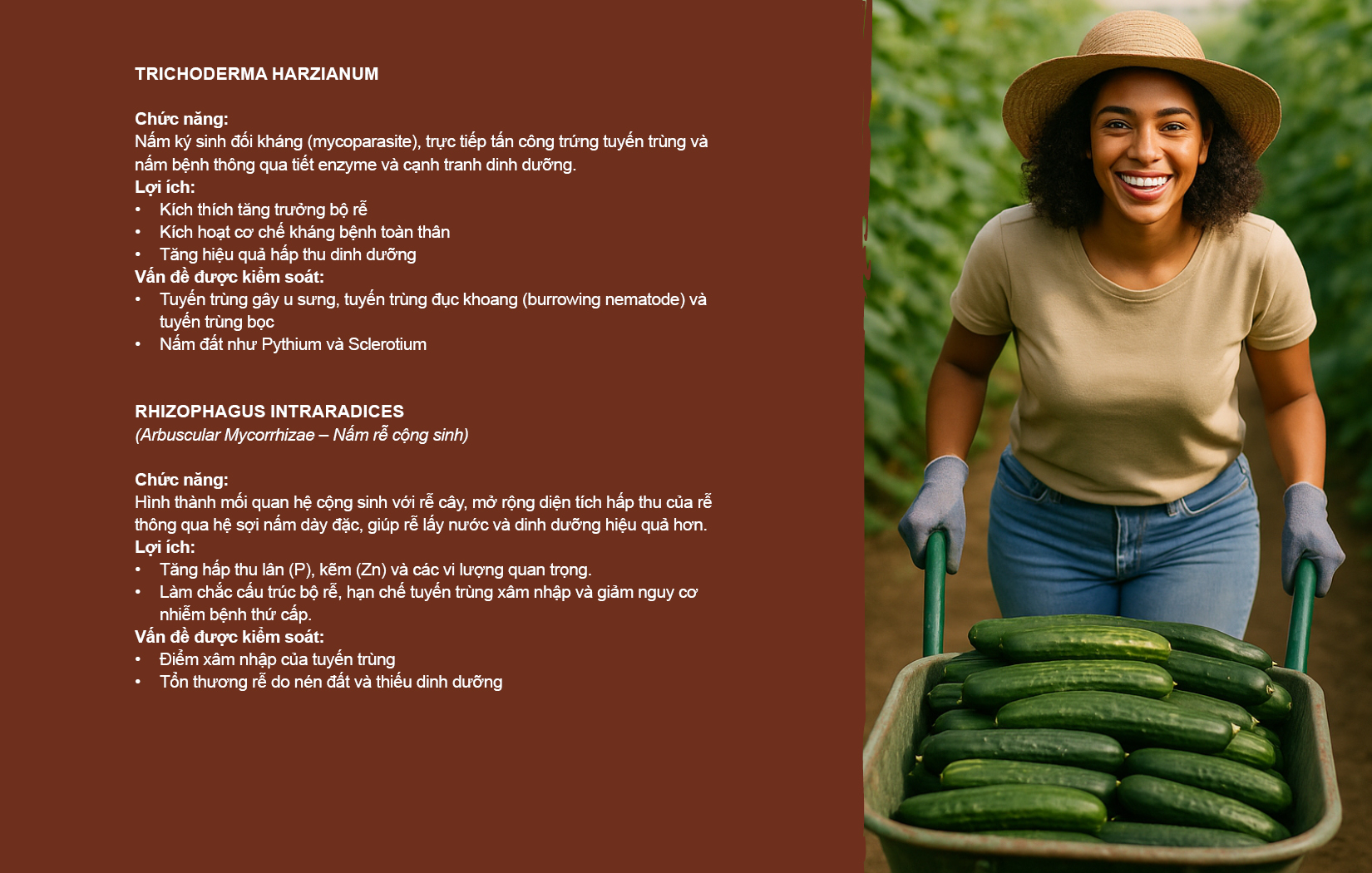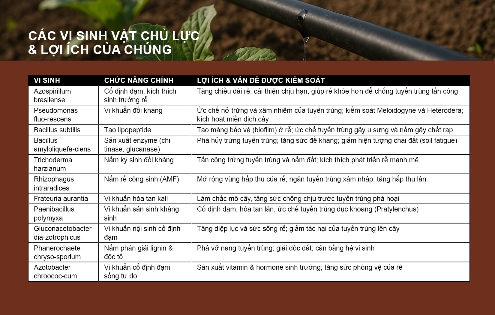 | Rhizophagus intraradices | Nấm rễ cộng sinh (AMF) | Mở rộng vùng hấp thu của rễ; ngăn tuyến trùng xâm nhập; tăng hấp thu lân |