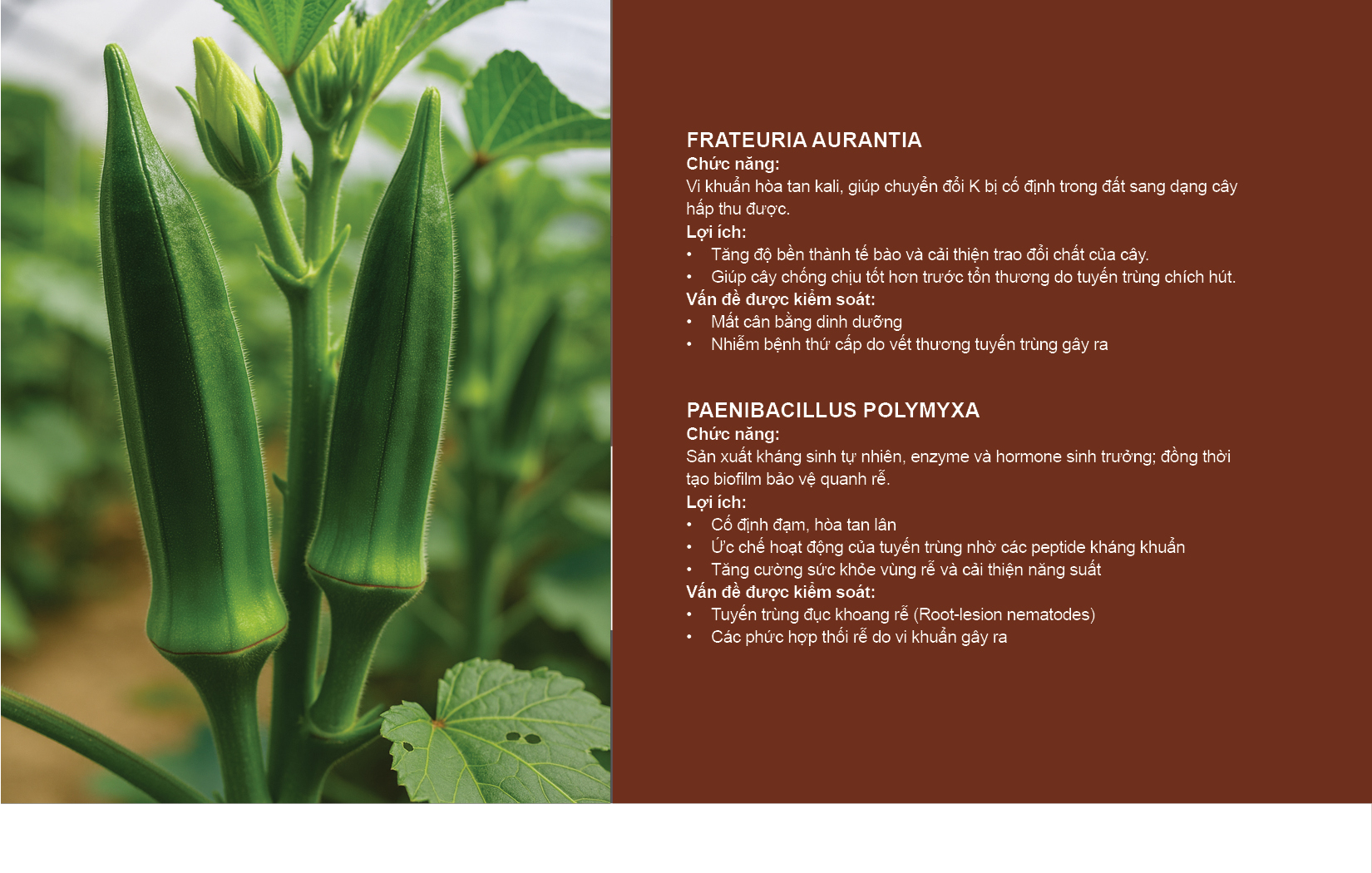 | Frateuria aurantia | Vi khuẩn hòa tan kali, giúp chuyển đổi K bị cố định trong đất sang dạng cây hấp thu được. | • Tăng độ bền thành tế bào và cải thiện trao đổi chất của cây. • Giúp cây chống chịu tốt hơn trước tổn thương do tuyến trùng chích hút. |