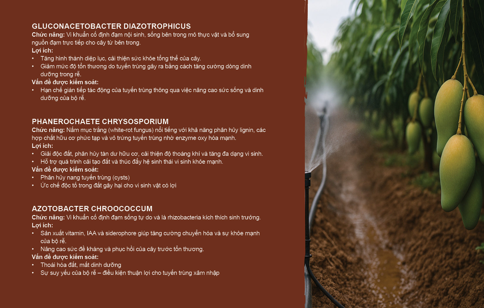 | Gluconacetobacter diazotrophicus | Vi khuẩn cố định đạm nội sinh, sống bên trong mô thực vật và bổ sung nguồn đạm trực tiếp cho cây từ bên trong. | • Tăng hình thành diệp lục, cải thiện sức khỏe tổng thể của cây. • Giảm mức độ tổn thương do tuyến trùng gây ra bằng cách tăng cường dòng dinh dưỡng trong rễ. |