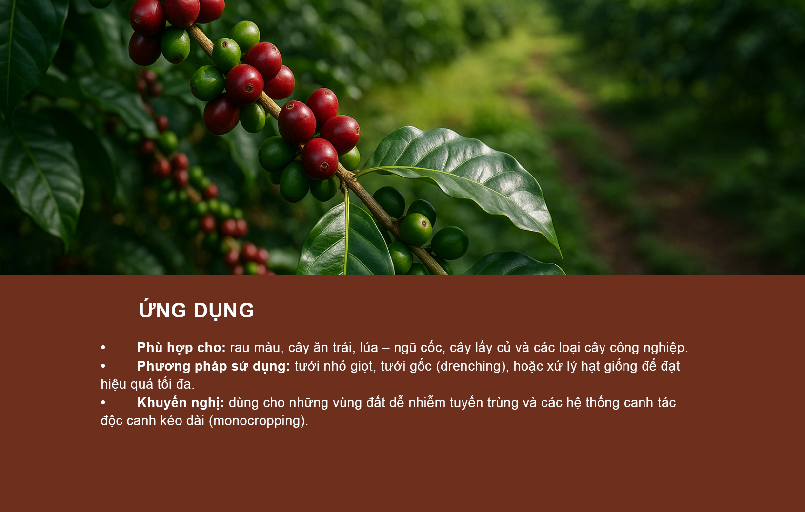 - Phương pháp sử dụng: tưới nhỏ giọt, tưới gốc (drenching), hoặc xử lý hạt giống để đạt hiệu quả tối đa.