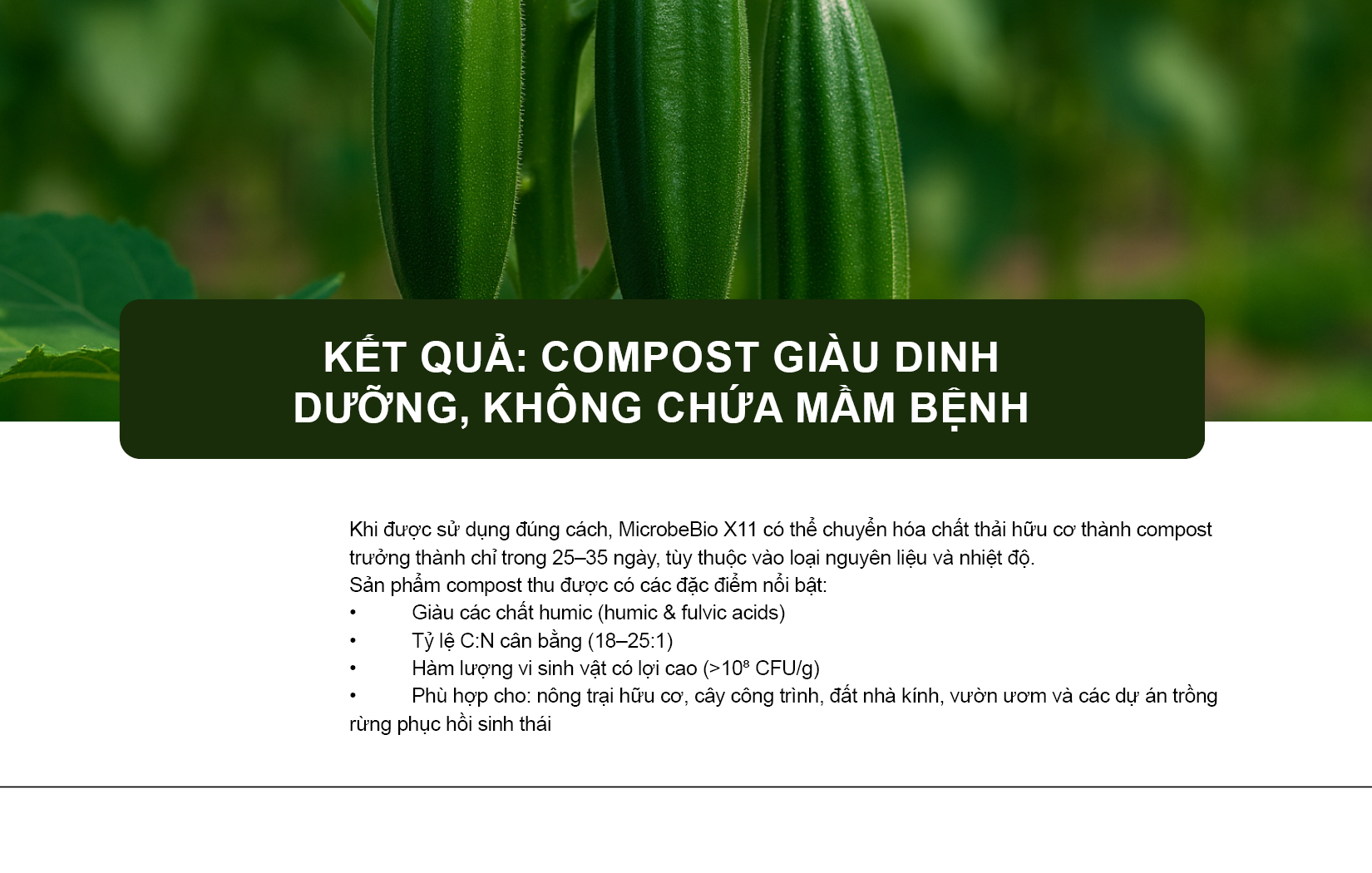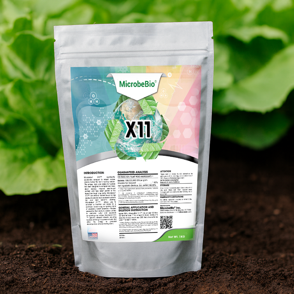 MicrobeBio X11 là một tổ hợp vi sinh mạnh mẽ được thiết kế để chuyển hóa chất thải hữu cơ thành compost giàu mùn với tốc độ vượt trội và hàm lượng dinh dưỡng cao.