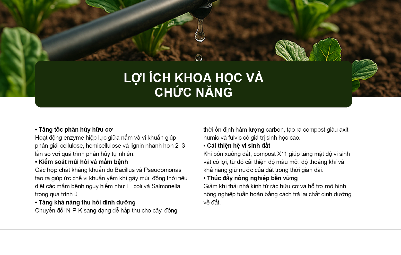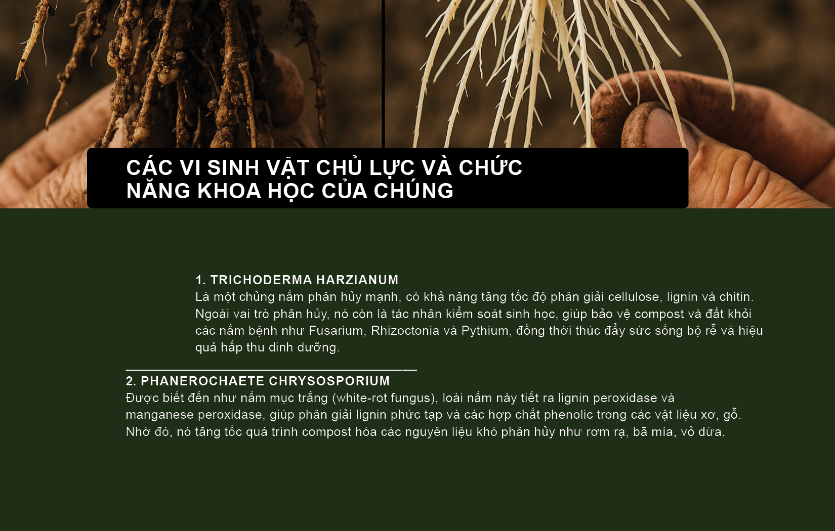 tạo nên một hệ sinh học hợp lực giúp tăng tốc phân giải hữu cơ, ức chế mầm bệnh, và phục hồi sức sống sinh học cho hệ sinh thái đất.