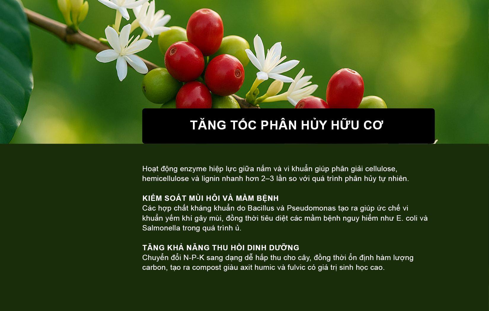 Chuyển đổi N-P-K sang dạng dễ hấp thu cho cây, đồng thời ổn định hàm lượng carbon, tạo ra compost giàu axit humic và fulvic có giá trị sinh học cao.