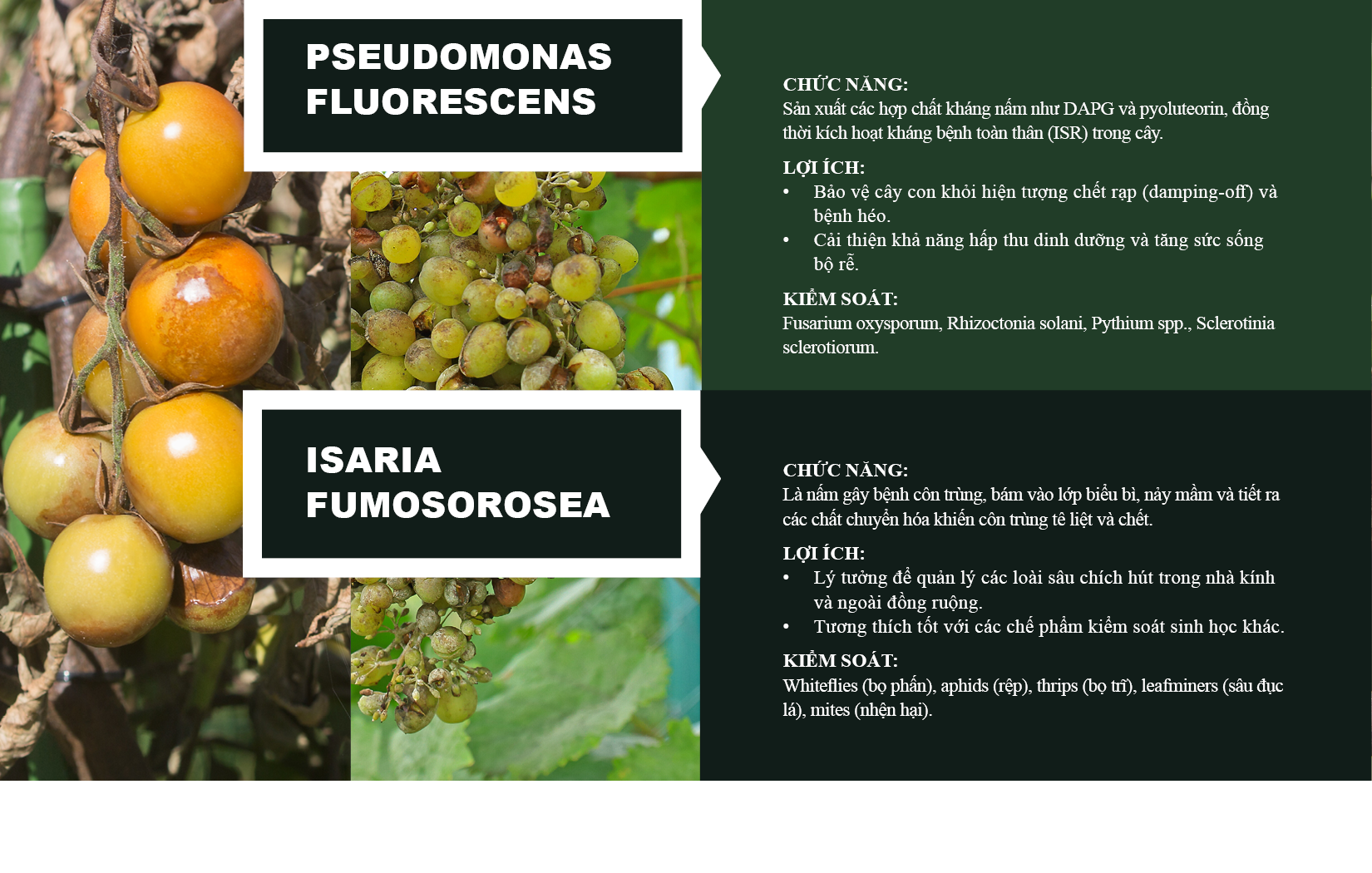 | Isaria fumosorosea | Nấm gây bệnh côn trùng, bám vào biểu bì và tiết chất chuyển hóa làm côn trùng tê liệt và chết. | • Phù hợp quản lý sâu chích hút trong nhà kính và ngoài đồng. • Tương thích với các chế phẩm sinh học khác. |