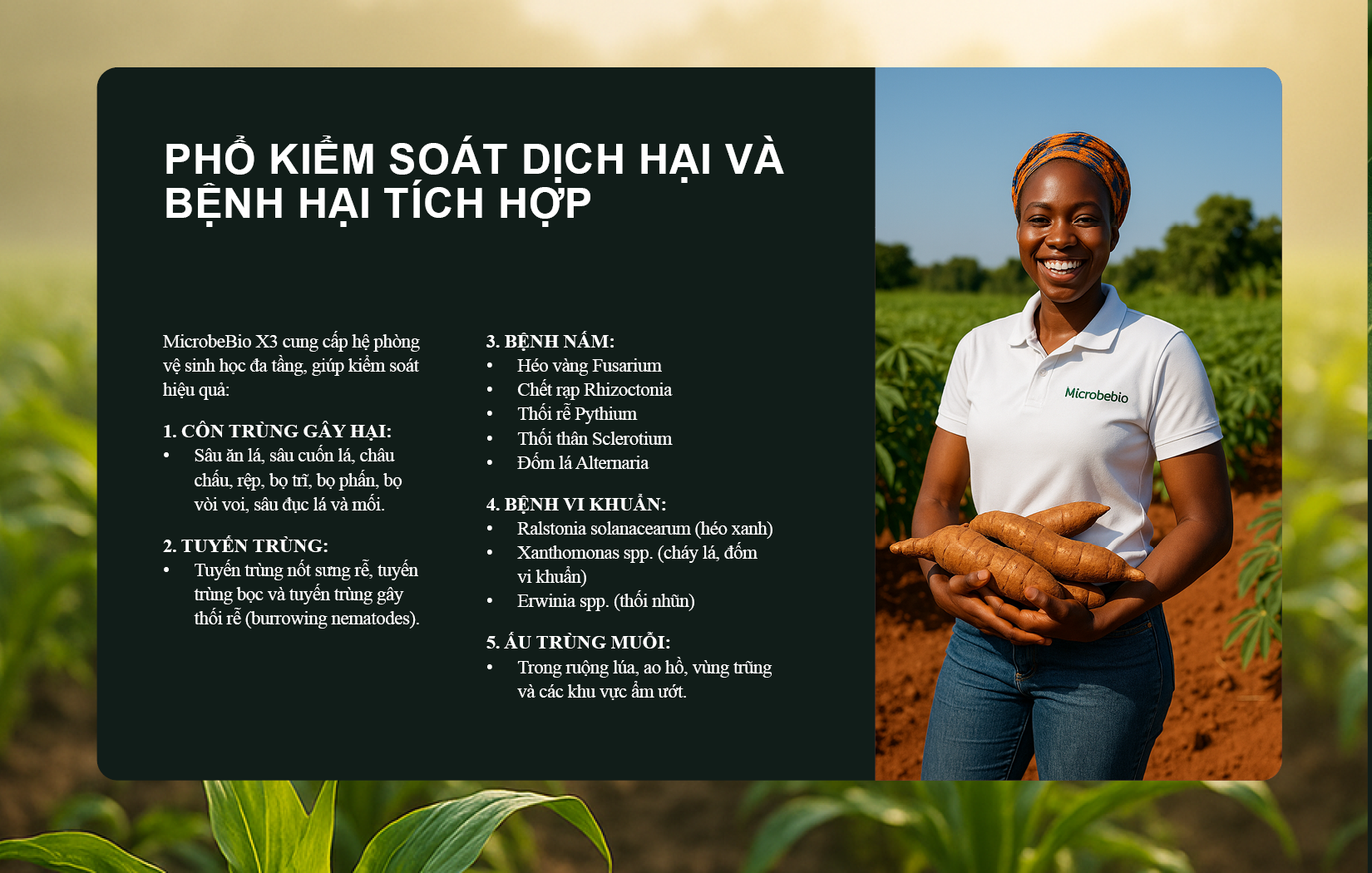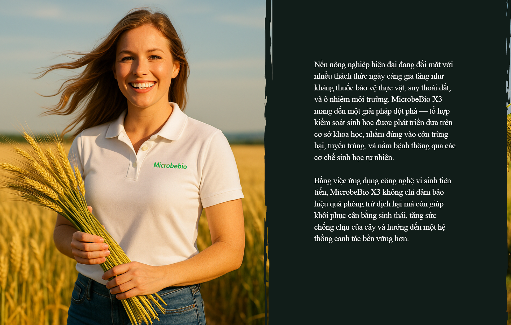 Bằng việc ứng dụng công nghệ vi sinh tiên tiến, MicrobeBio X3 không chỉ đảm bảo hiệu quả phòng trừ dịch hại mà còn giúp khôi phục cân bằng sinh thái, tăng sức chống chịu của cây và hướng đến một hệ thống canh tác bền vững hơn.