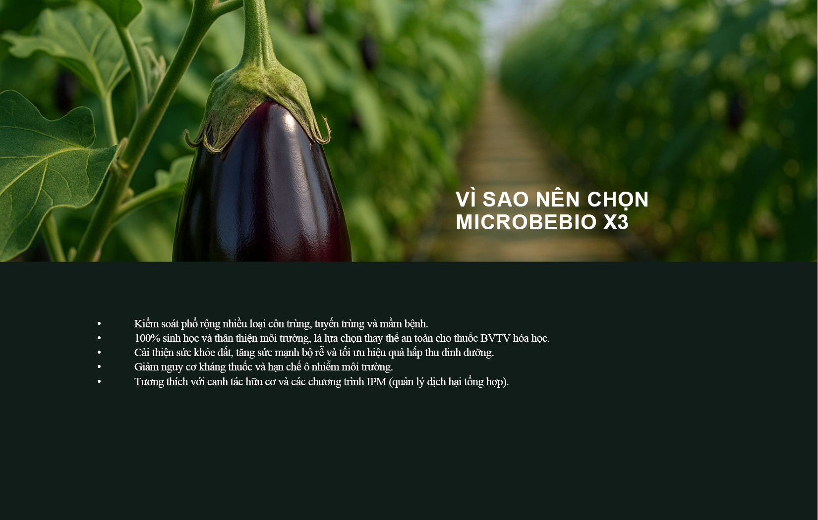 MicrobeBio X3 là thế hệ mới của công nghệ quản lý dịch hại sinh học, kết hợp nấm ký sinh côn trùng, vi khuẩn có lợi, tác nhân ăn tuyến trùng và virus kiểm soát sâu hại trong một công thức hiệp lực duy nhất.