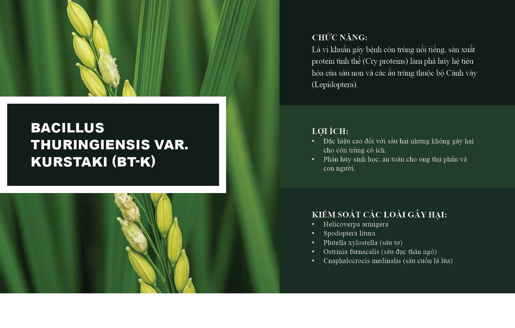 | Bacillus thuringiensis var. kurstaki (Bt-k) | Vi khuẩn gây bệnh côn trùng, sản xuất protein tinh thể (Cry proteins) phá hủy hệ tiêu hóa của sâu non thuộc bộ Cánh vảy (Lepidoptera). | • Đặc hiệu cao với sâu hại nhưng không gây hại côn trùng có ích. • Phân hủy sinh học, an toàn cho ong thụ phấn và con người. |