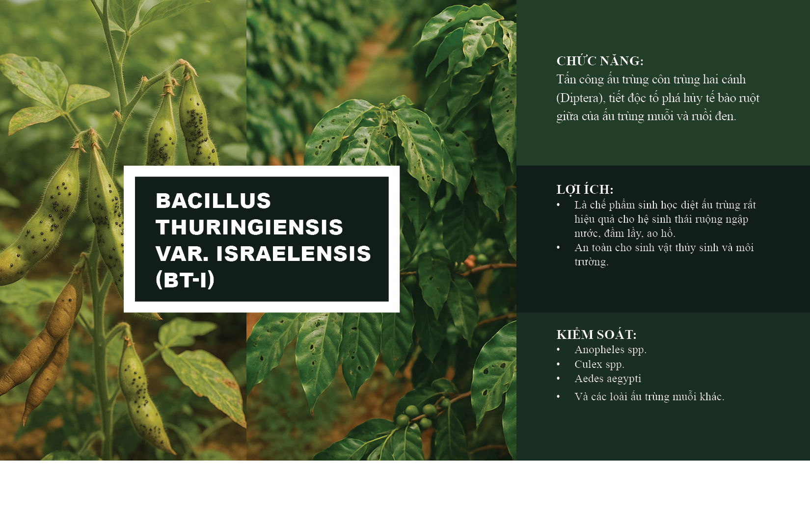 | Bacillus thuringiensis var. israelensis (Bt-i) | Tấn công ấu trùng côn trùng hai cánh (Diptera), tiết độc tố phá hủy tế bào ruột giữa của ấu trùng muỗi và ruồi đen. | • Diệt ấu trùng rất hiệu quả trong ruộng ngập nước, ao hồ, đầm lầy. • An toàn cho sinh vật thủy sinh và môi trường. |