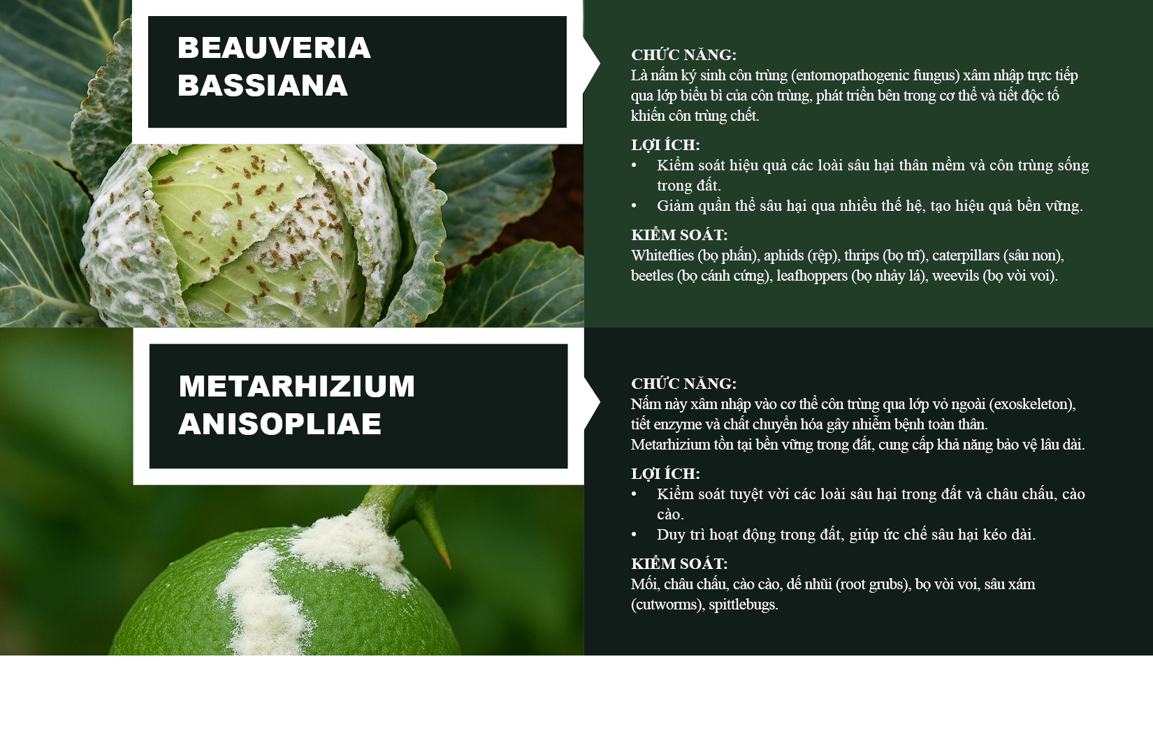 Sự phối hợp toàn diện này giúp kiểm soát hiệu quả côn trùng gây hại, tuyến trùng, và nấm bệnh, đồng thời cải thiện sức khỏe cây trồng và nâng cao tính bền vững của hệ sinh thái.