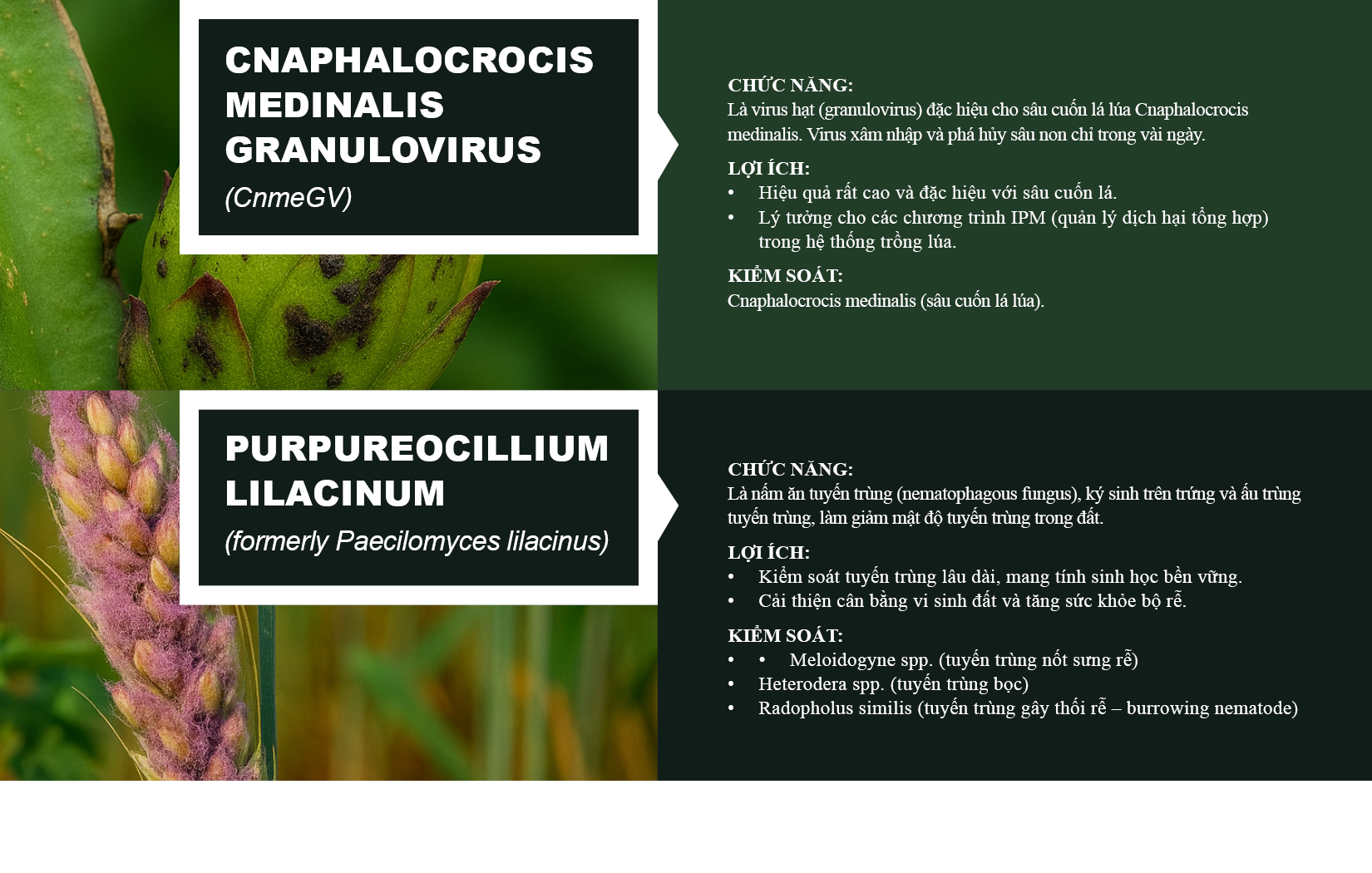 | Cnaphalocrocis medinalis Granulovirus (CnmeGV) | Virus hạt (granulovirus) đặc hiệu cho sâu cuốn lá lúa, phá hủy sâu non chỉ trong vài ngày. | • Hiệu quả rất cao và đặc hiệu. • Lý tưởng cho chương trình IPM trong canh tác lúa. |