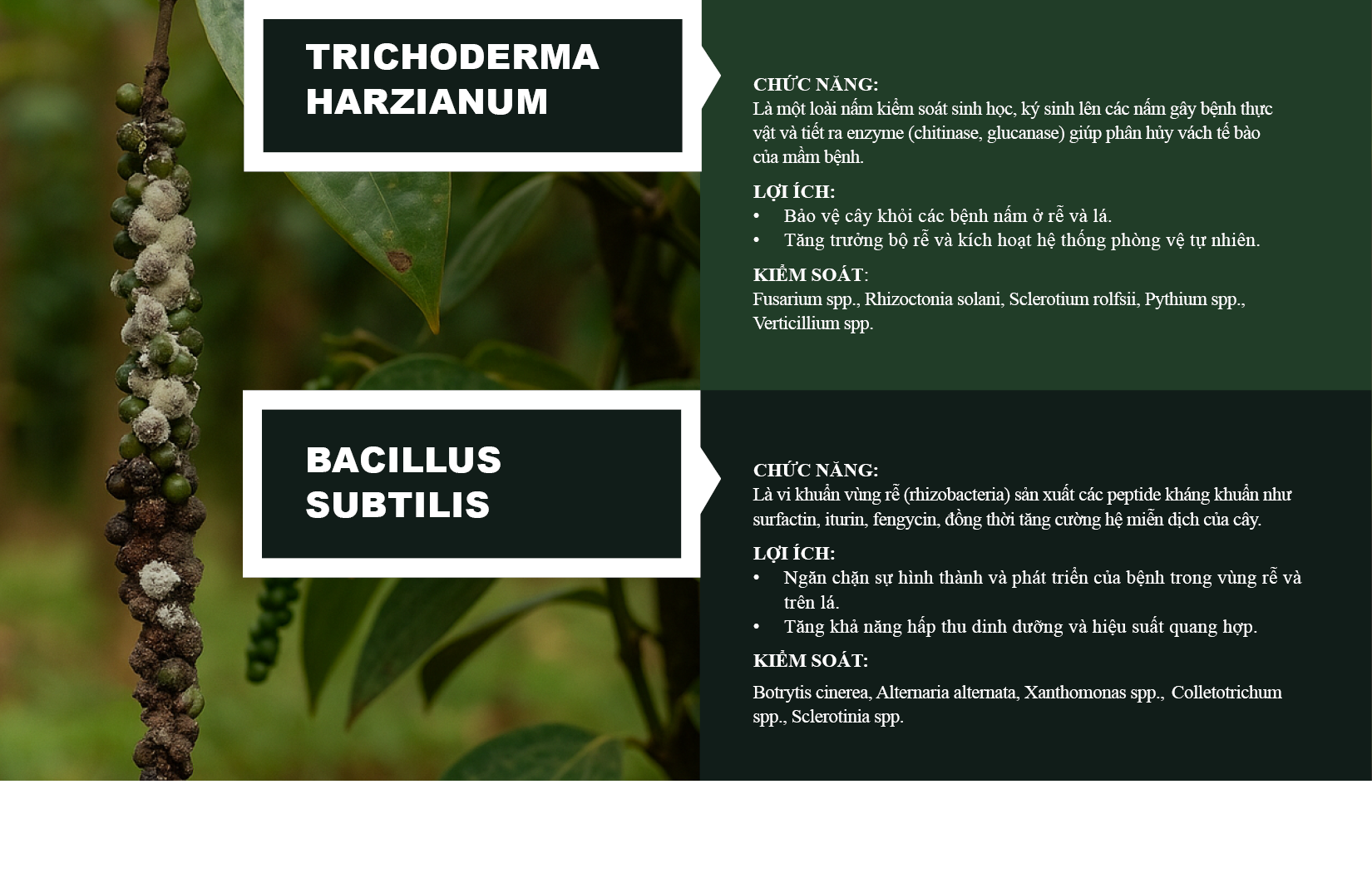 | Trichoderma harzianum | Nấm kiểm soát sinh học, ký sinh nấm bệnh và tiết enzyme (chitinase, glucanase) phân hủy vách tế bào mầm bệnh. | • Bảo vệ rễ và lá khỏi bệnh nấm. • Tăng trưởng rễ và kích hoạt phòng vệ tự nhiên. |