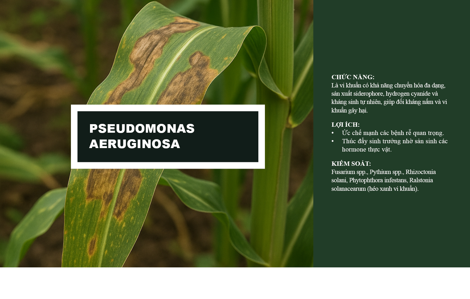 | Pseudomonas fluorescens | Sản xuất DAPG, pyoluteorin và kích hoạt kháng bệnh toàn thân (ISR). | • Bảo vệ cây con khỏi chết rạp và bệnh héo. • Tăng hấp thu dinh dưỡng và sức sống rễ. |