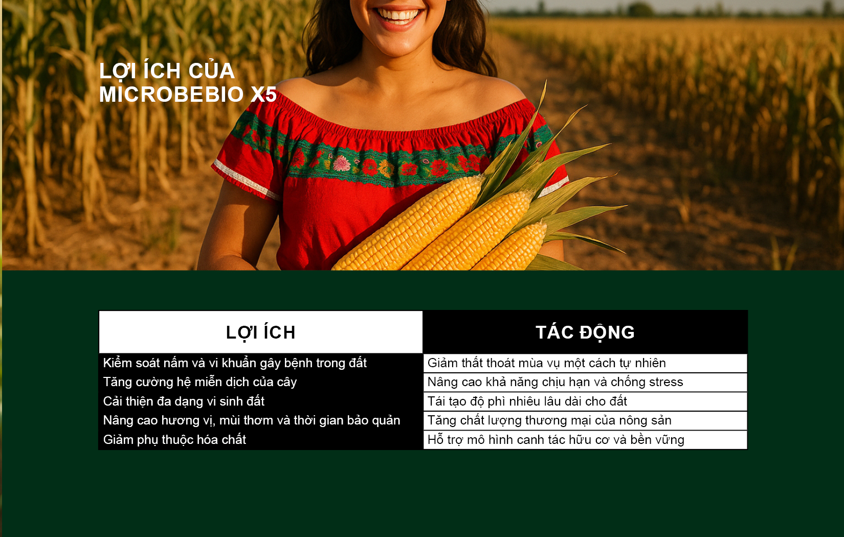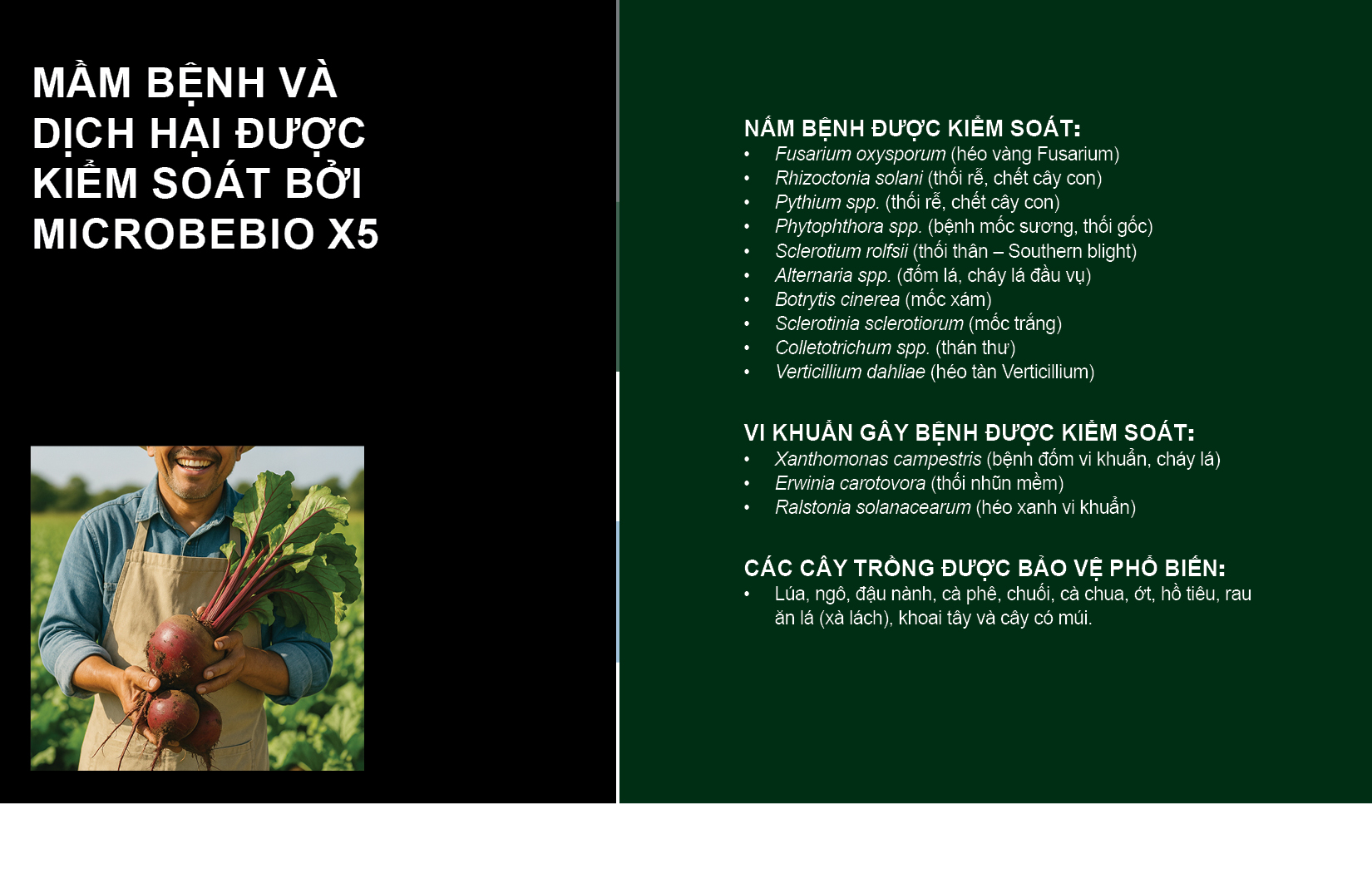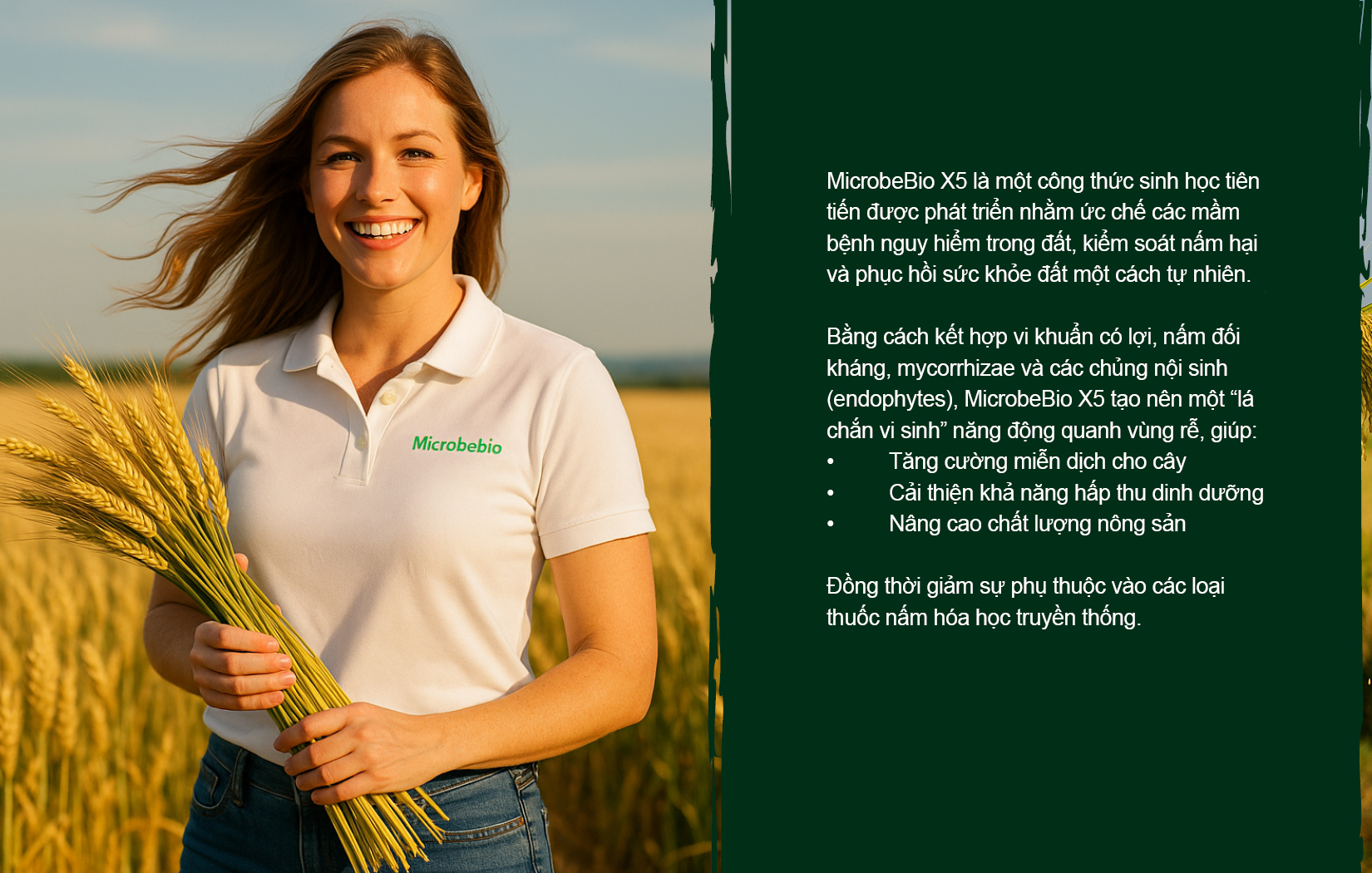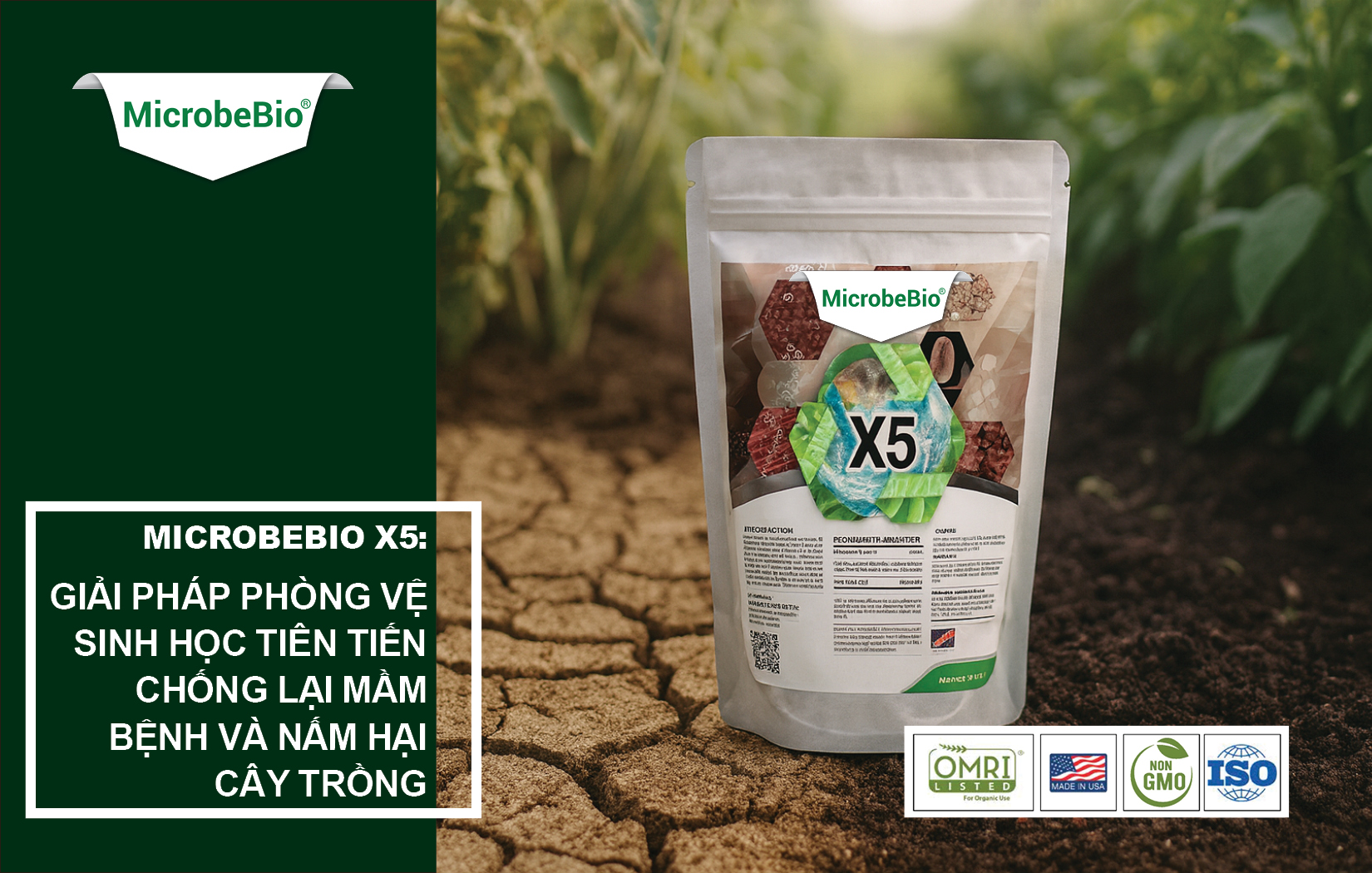 MicrobeBio X5 kết hợp khoa học vi sinh tiên tiến với sức mạnh tự nhiên nhằm kiểm soát mầm bệnh, tái tạo đất và bảo vệ cây trồng từ bộ rễ đến trái.