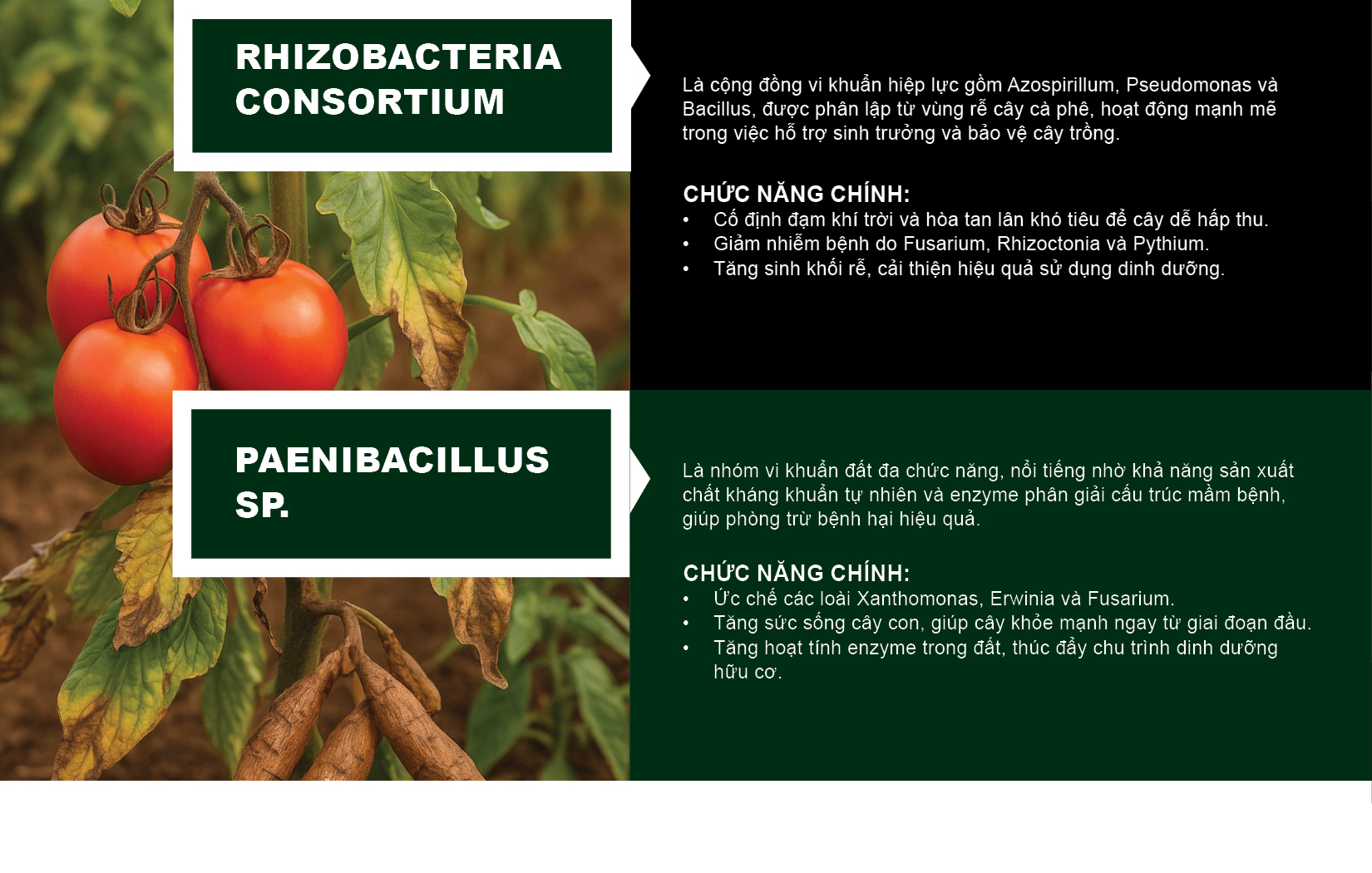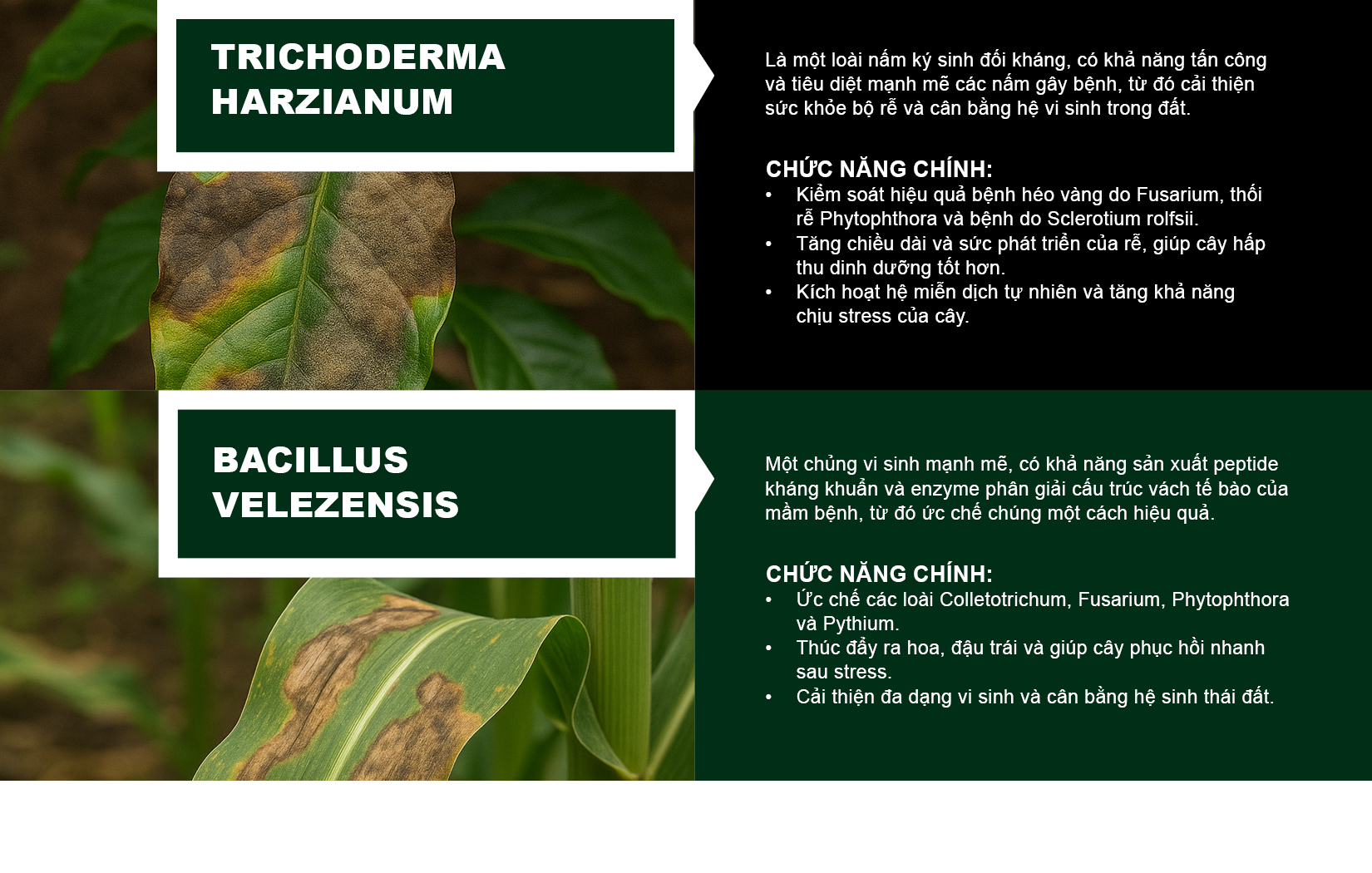 Hai chủng vi khuẩn có lợi này hoạt động như tác nhân kiểm soát sinh học tự nhiên, tạo lớp biofilm bảo vệ trên bề mặt rễ và tiết ra các lipopeptide kháng nấm mạnh mẽ.