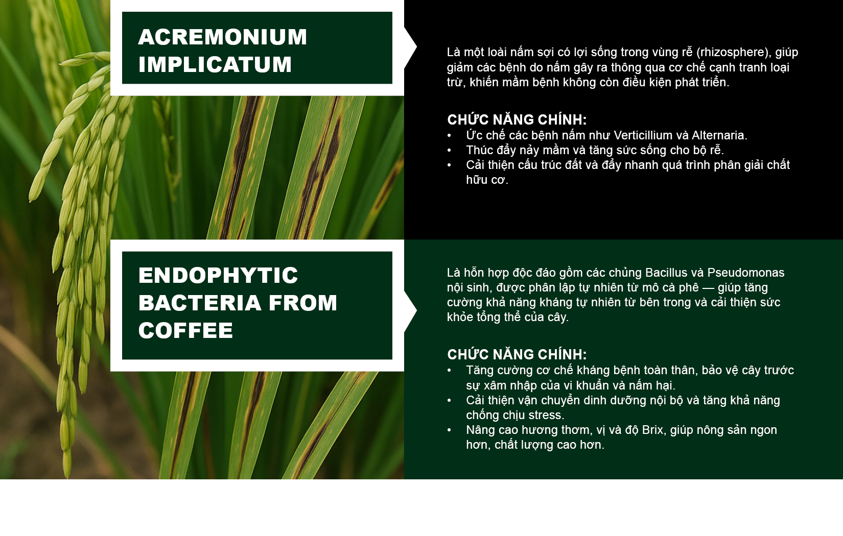 Là hỗn hợp độc đáo gồm các chủng Bacillus và Pseudomonas nội sinh, được phân lập tự nhiên từ mô cà phê — giúp tăng cường khả năng kháng tự nhiên từ bên trong và cải thiện sức khỏe tổng thể của cây.