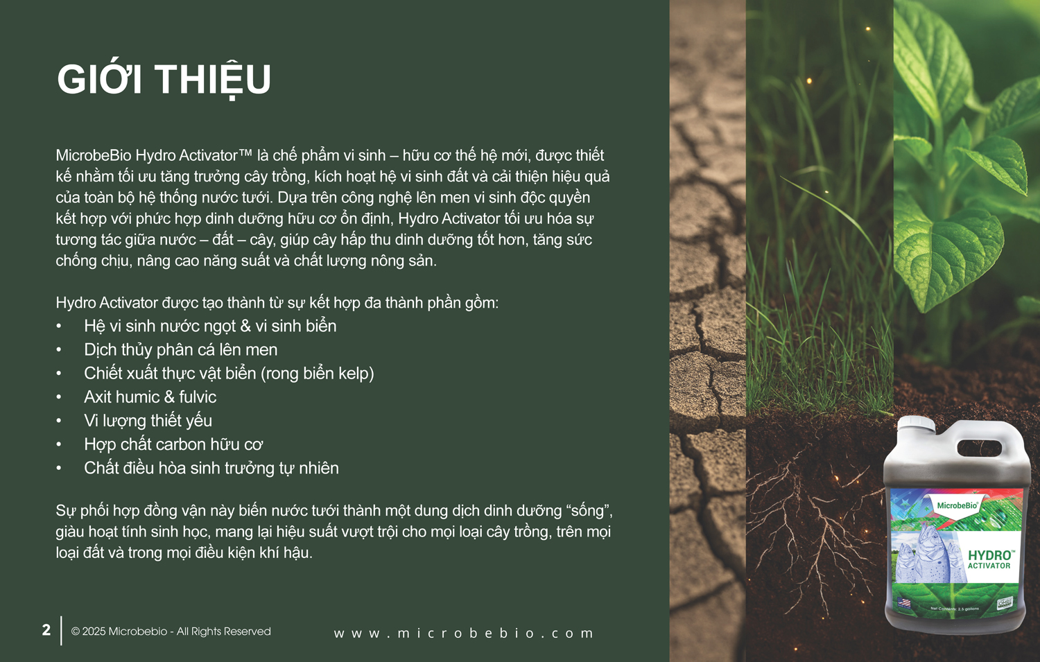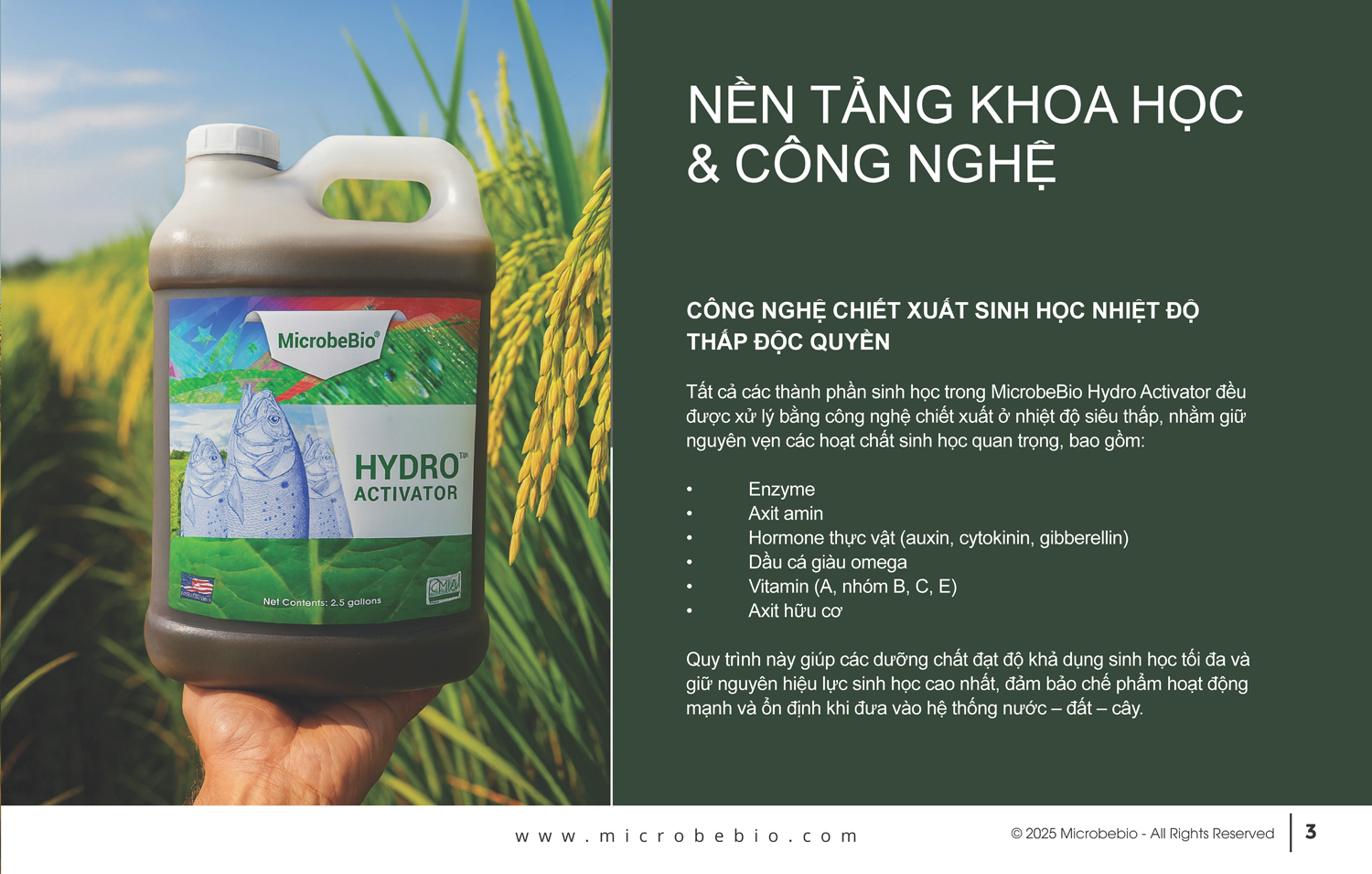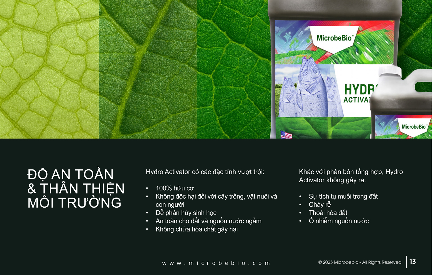 Hydro Activator tận dụng toàn bộ protein và dầu tự nhiên, phân giải chậm giúp cây trồng hấp thụ trong thời gian dài. Chúng tôi sử dụng quy trình thế hệ mới độc quyền, kết hợp nitơ, lân, kali hữu cơ tiên tiến; vật chất sinh học; chiết xuất thực vật biển; và hơn 70 loại khoáng vi lượng.