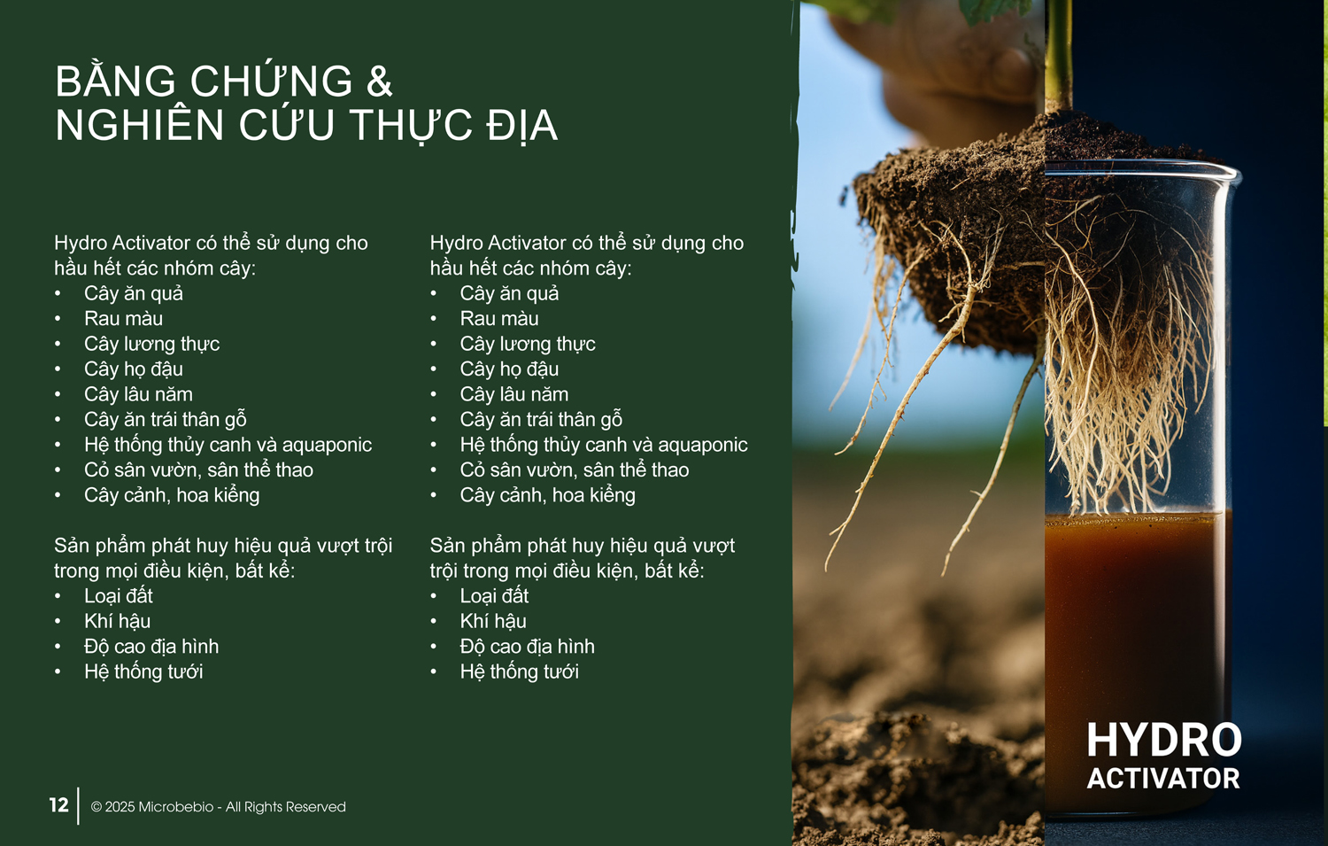 Hydro Activator thúc đẩy sinh trưởng và mang lại năng suất cao hơn mỗi mùa — bất kể loại cây trồng, điều kiện khí hậu, loại đất hay địa hình.