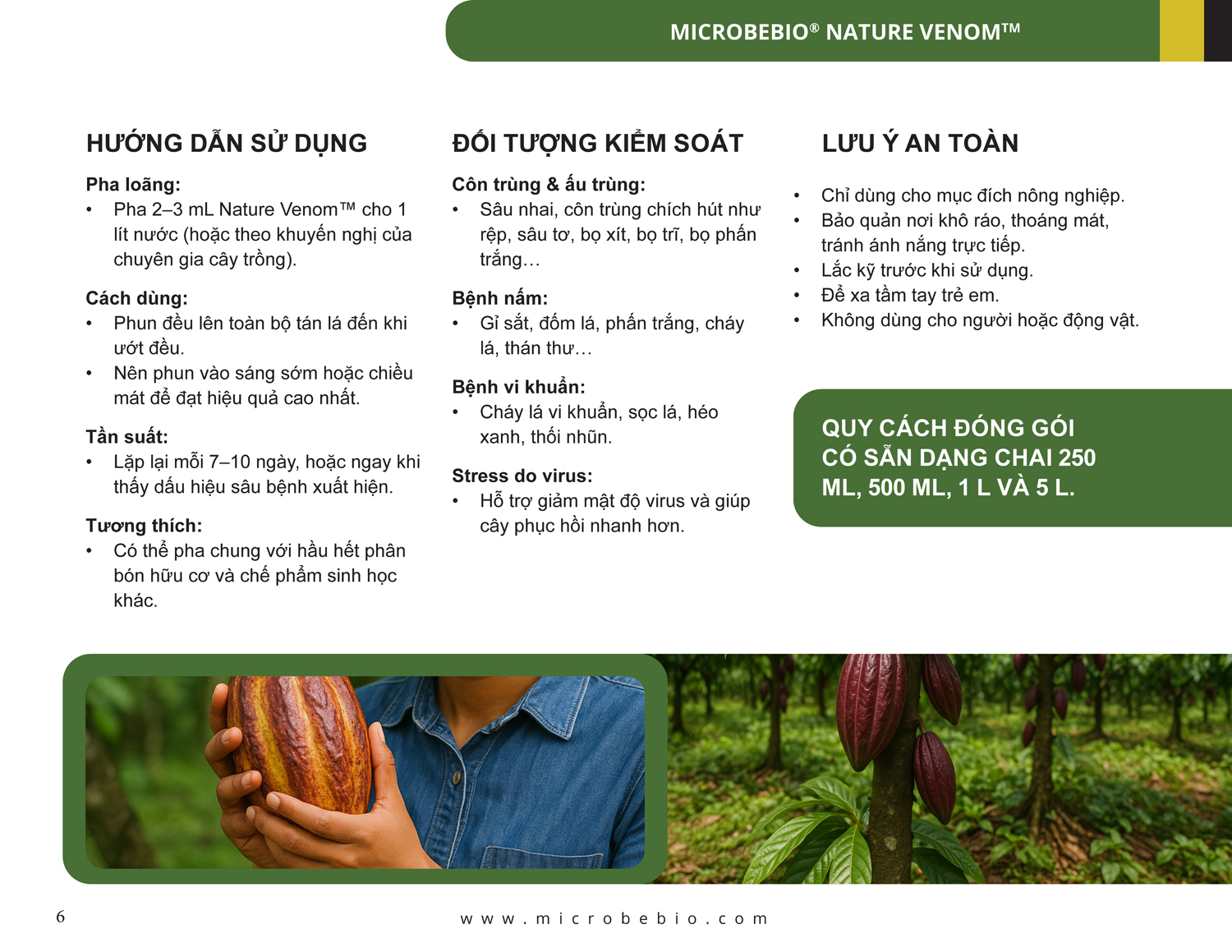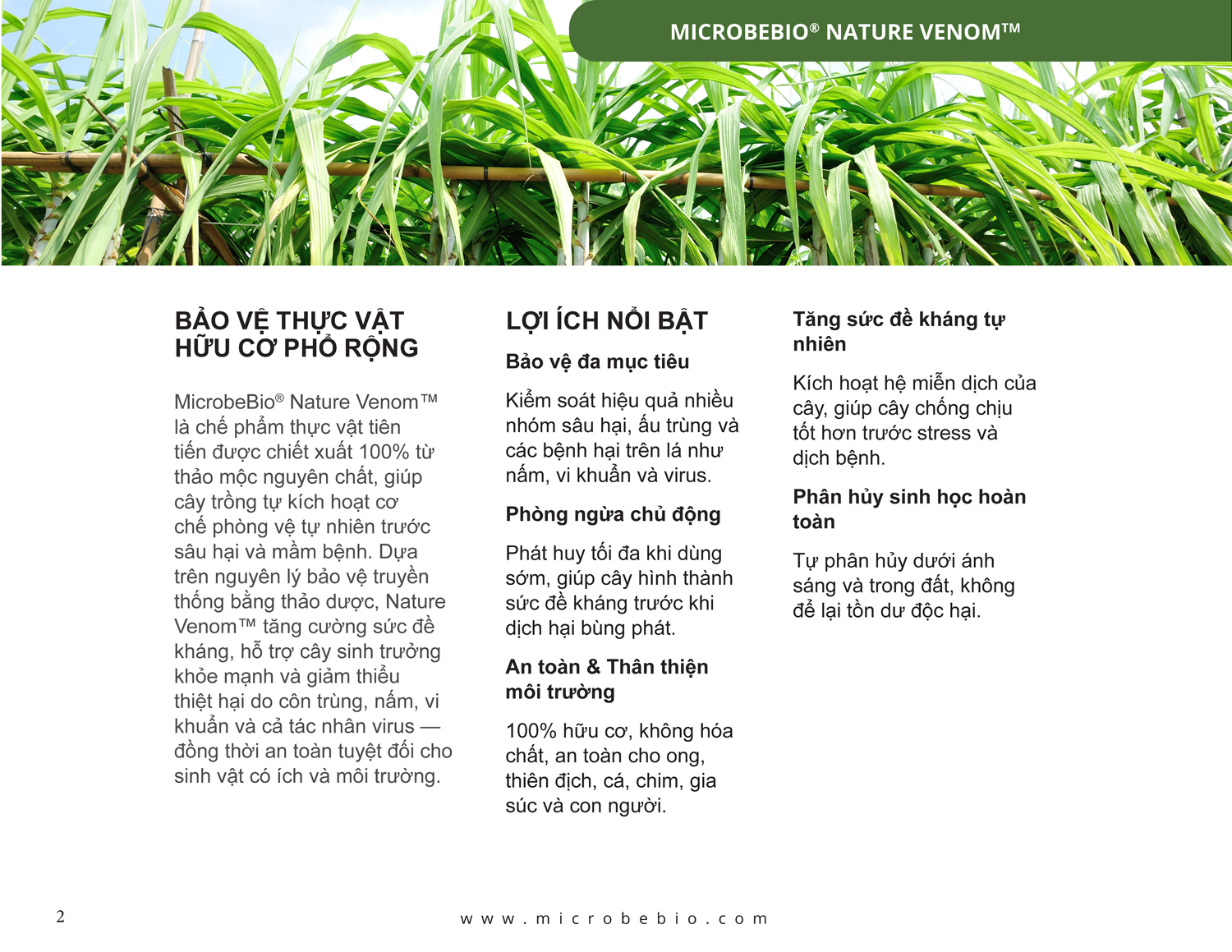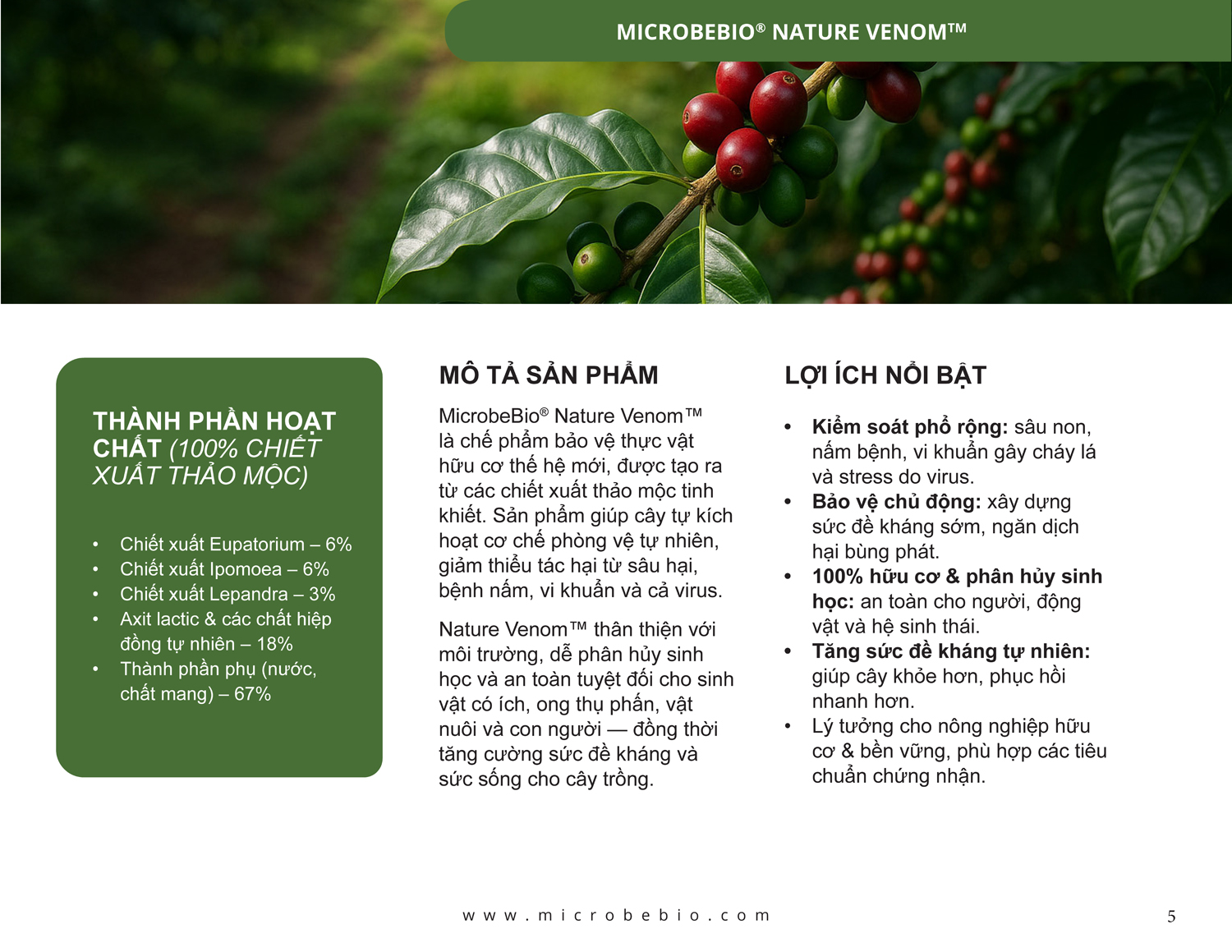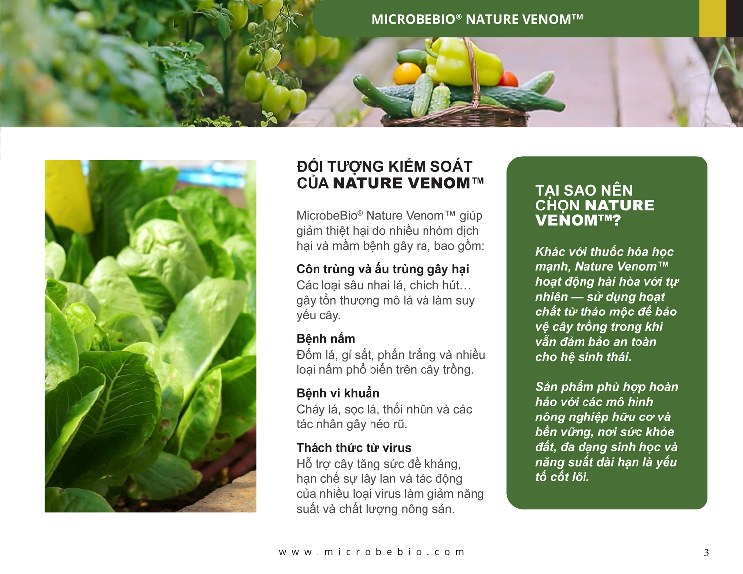 MicrobeBio® Nature Venom™ là công thức chiết xuất thực vật tiên tiến được tạo thành từ 100% tinh chất thực vật nguyên chất, được thiết kế để giúp cây trồng tự nhiên chống lại sâu hại và mầm bệnh gây hại. Dựa trên nguyên lý bảo vệ cây trồng truyền thống từ thực vật, Nature Venom™ tăng cường sức đề kháng của cây, hỗ trợ sinh trưởng khỏe mạnh và giảm thiệt hại do côn trùng, nấm, vi khuẩn, thậm chí cả các tác nhân virus — đồng thời vẫn an toàn cho sinh vật có ích và môi trường.