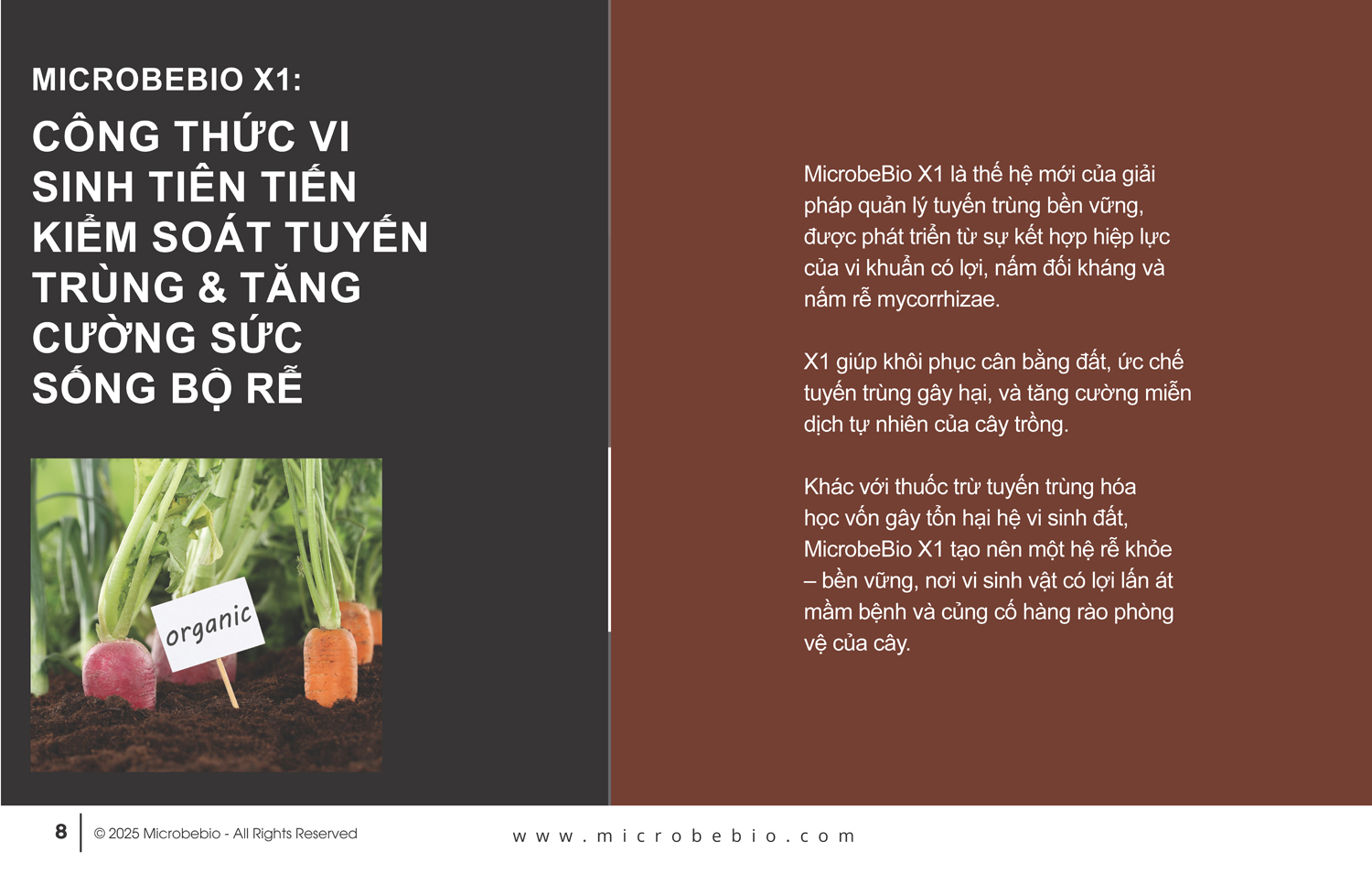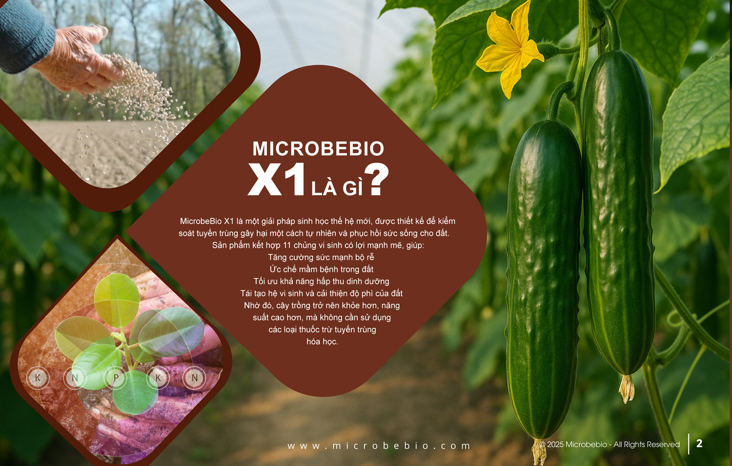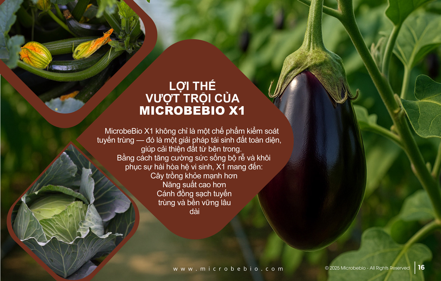 Với khả năng chống lại các tuyến trùng gây hại, Microbebio® X1™ ngay khi được sử dụng sẽ cho hiệu quả tốt nhất vì một mặt, sản phẩm cung cấp nguồn dinh dưỡng đa-trung-vi lượng hữu cơ thiết yếu. Mặt khác, sản phẩm Microbebio® X1™ chứa nhiều loại vi sinh hữu ích độc quyền, là những chiến binh chống lại tuyến trùng gây hại. Sản phẩm thúc đẩy sự tăng trưởng mạnh hệ vi sinh hữu ích trong đất. Nhờ vậy cấu trúc đất được cải tạo, đất trở nên khỏe mạnh, mầu mỡ, nguồn dinh dưỡng được duy trì và tăng lên từng ngày nhờ vào hoạt động phân giải của các vi sinh vật hữu ích. Vì vậy, cây trồng sẽ nhận được đầy đủ dinh dưỡng trong mọi giai đoạn phát triển. Đủ dinh dưỡng là nền tảng cho một quá trình sinh trưởng khỏe mạnh, mà cây trồng khỏe mạnh thì khả năng miễn dịch tự thân để kháng lại bệnh hại và những tuyến trùng gây hại diễn ra mạnh mẽ. Đồng thời, vi sinh trong sản phẩm Microbebio® X1™ giúp phá vở cấu trúc của tuyến trùng gây hại từ trong trứng nước. Các ấu trùng trứng gây hại bị phân hủy. Đối với tuyến trùng gây hai đã trưởng thành sẽ mất khả năng vận động và mất dần sự sống. Để quá trình chống lại sự tấn công của các tuyến trùng gây hại đạt hiệu quả. Sản phẩm được khuyến khích áp dụng cùng lúc với việc bón lót (trước lúc trồng).