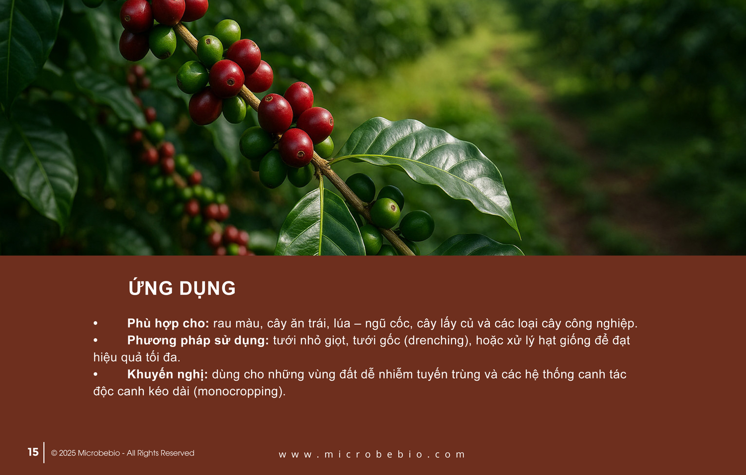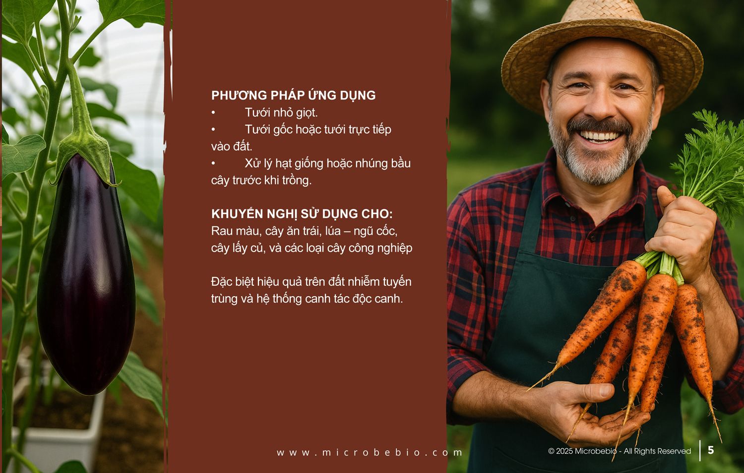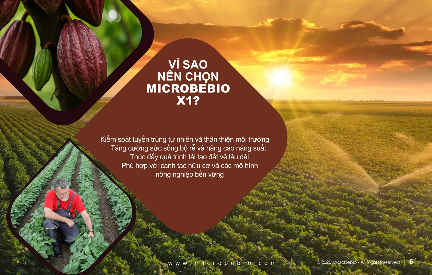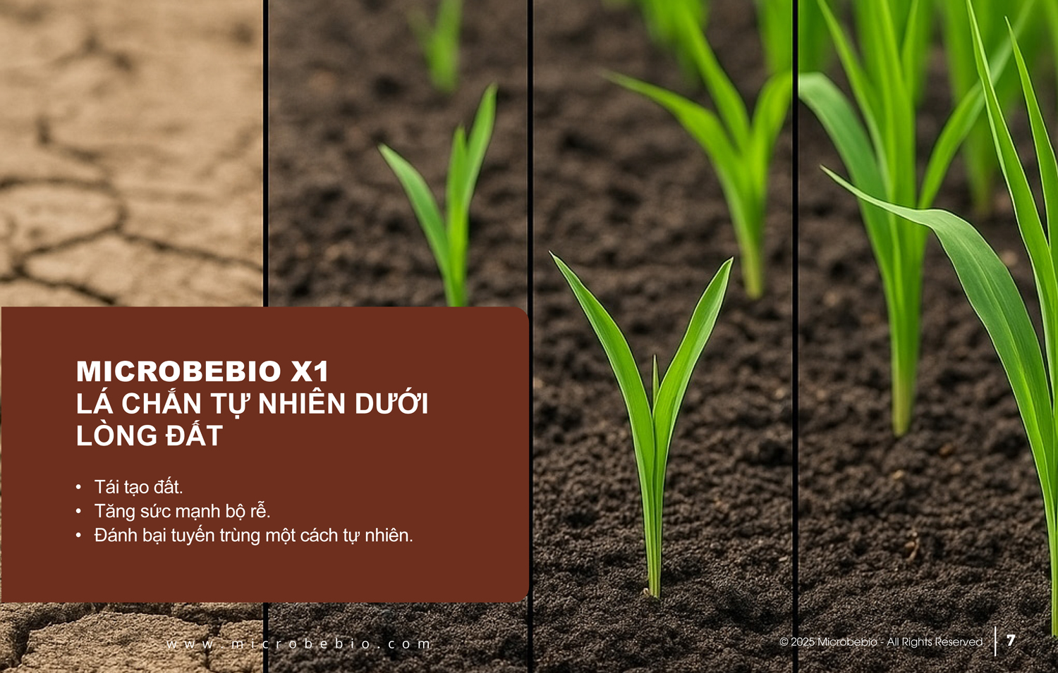 Với khả năng chống lại các tuyến trùng gây hại, Microbebio® X1™ ngay khi được sử dụng sẽ cho hiệu quả tốt nhất vì một mặt, sản phẩm cung cấp nguồn dinh dưỡng đa-trung-vi lượng hữu cơ thiết yếu. Mặt khác, sản phẩm Microbebio® X1™ chứa nhiều loại vi sinh hữu ích độc quyền, là những chiến binh chống lại tuyến trùng gây hại. Sản phẩm thúc đẩy sự tăng trưởng mạnh hệ vi sinh hữu ích trong đất. Nhờ vậy cấu trúc đất được cải tạo, đất trở nên khỏe mạnh, mầu mỡ, nguồn dinh dưỡng được duy trì và tăng lên từng ngày nhờ vào hoạt động phân giải của các vi sinh vật hữu ích. Vì vậy, cây trồng sẽ nhận được đầy đủ dinh dưỡng trong mọi giai đoạn phát triển. Đủ dinh dưỡng là nền tảng cho một quá trình sinh trưởng khỏe mạnh, mà cây trồng khỏe mạnh thì khả năng miễn dịch tự thân để kháng lại bệnh hại và những tuyến trùng gây hại diễn ra mạnh mẽ. Đồng thời, vi sinh trong sản phẩm Microbebio® X1™ giúp phá vở cấu trúc của tuyến trùng gây hại từ trong trứng nước. Các ấu trùng trứng gây hại bị phân hủy. Đối với tuyến trùng gây hai đã trưởng thành sẽ mất khả năng vận động và mất dần sự sống. Để quá trình chống lại sự tấn công của các tuyến trùng gây hại đạt hiệu quả. Sản phẩm được khuyến khích áp dụng cùng lúc với việc bón lót (trước lúc trồng).